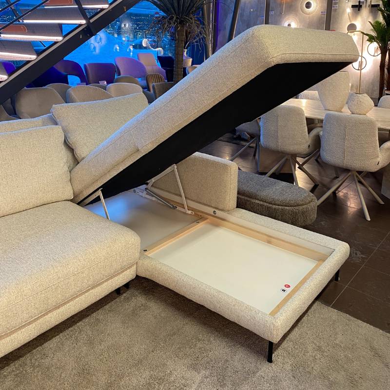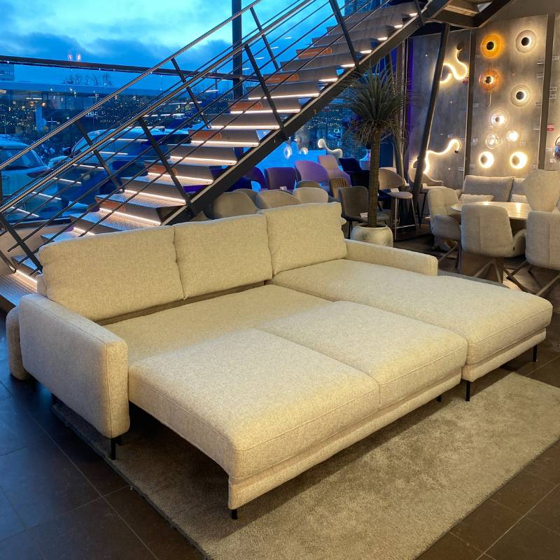 Labai minkštas kreminės spalvos kampas su miegojimo funkcija ir patalynės dėže, sukurtas maksimaliam komfortui ir jaukumui namuose.