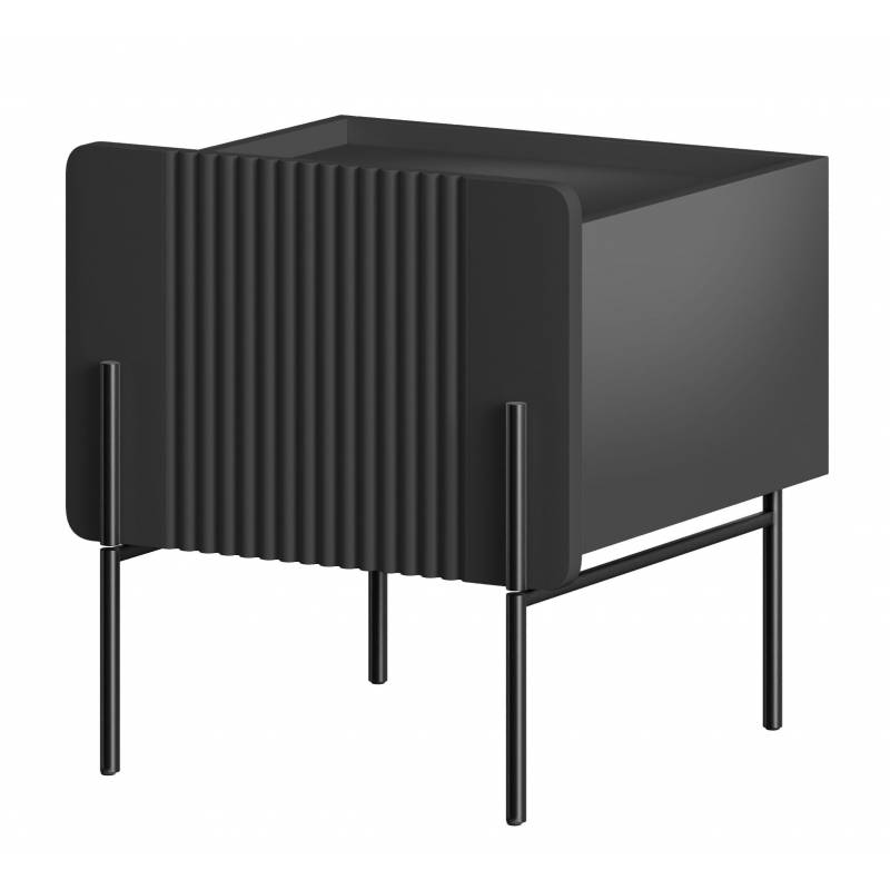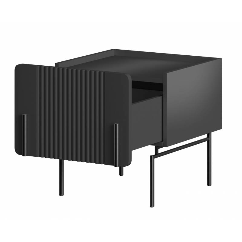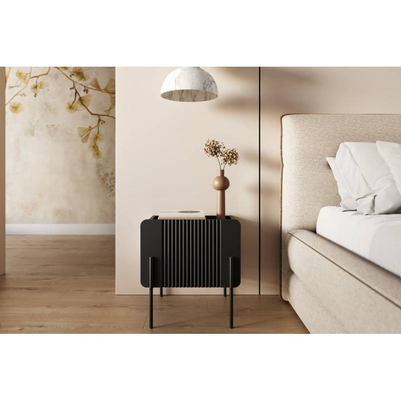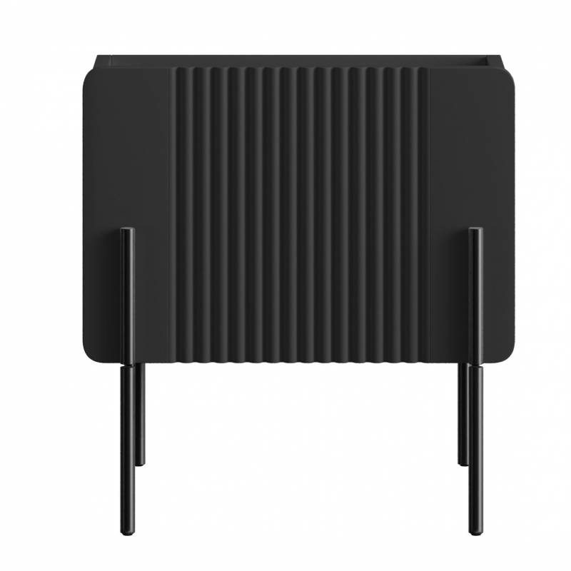 Modernus naktinis staliukas su metalinėmis kojelėmis ir grioveliais puošta priekine dalimi – elegantiškas bei funkcionalus pasirinkimas.