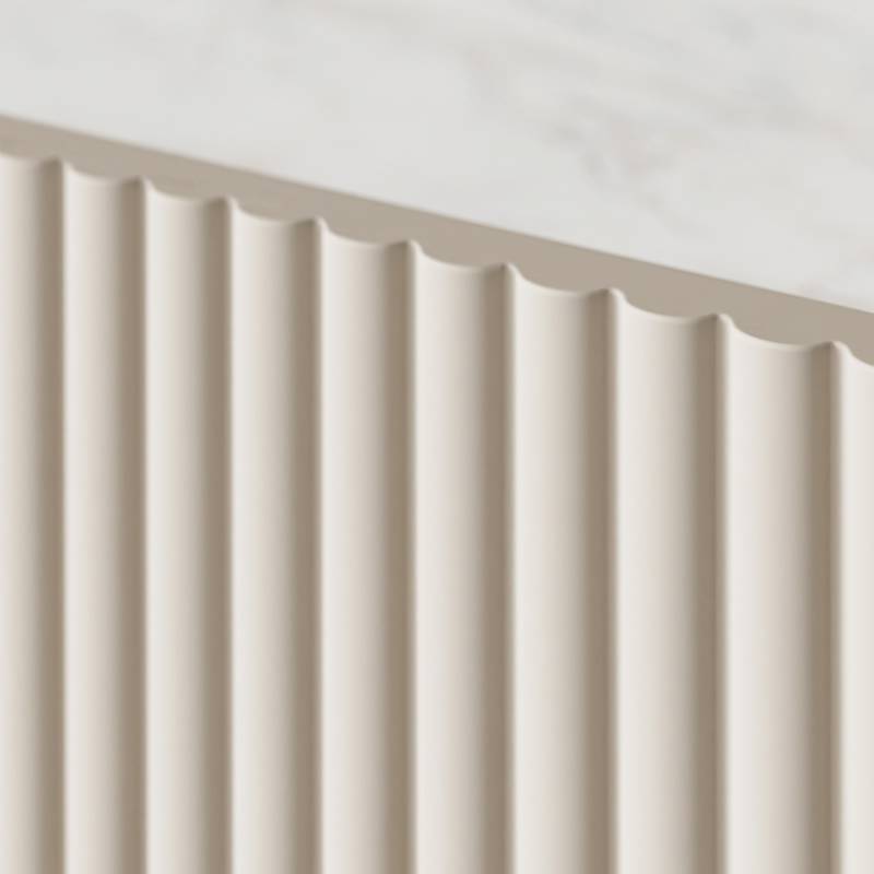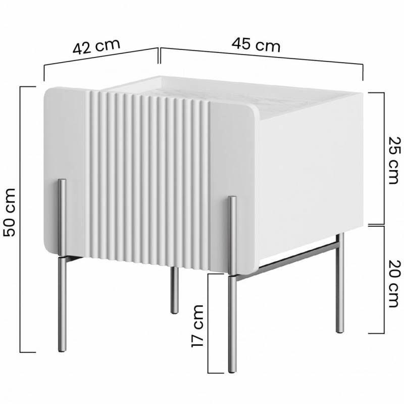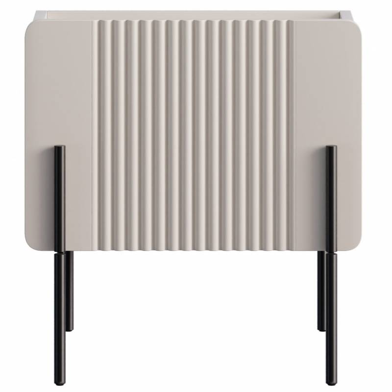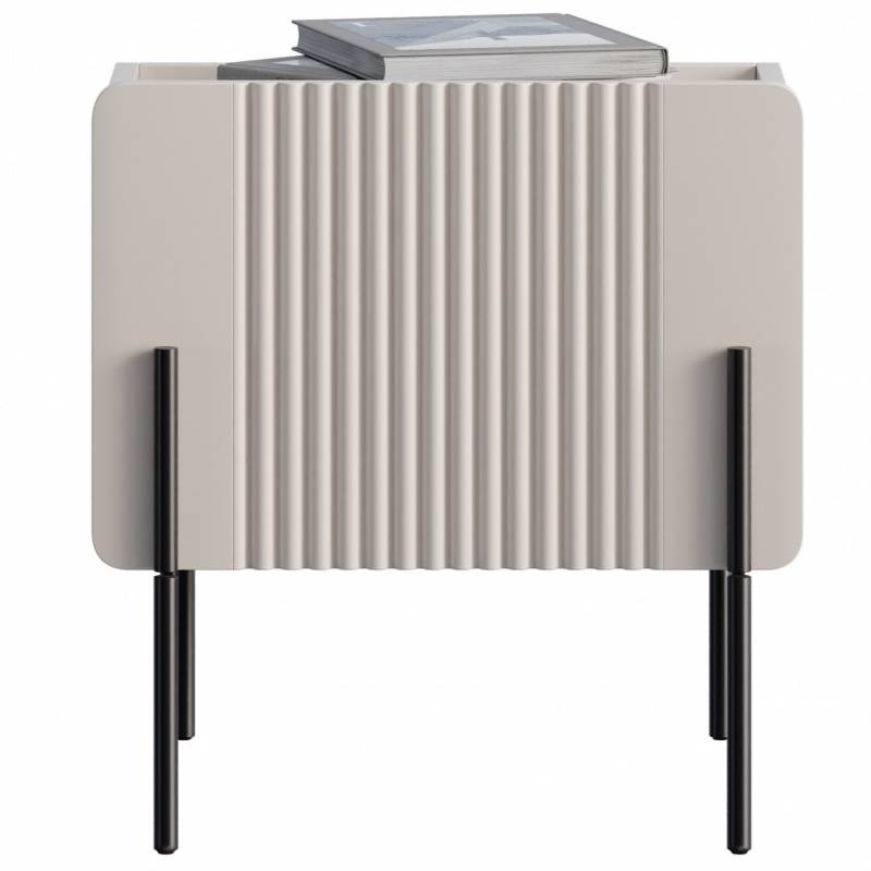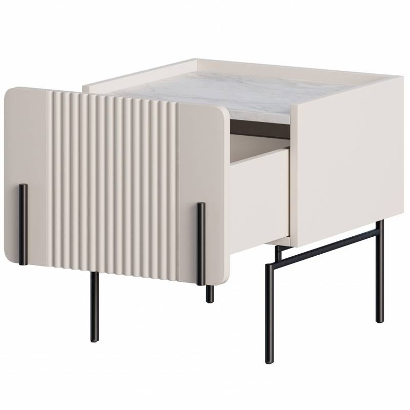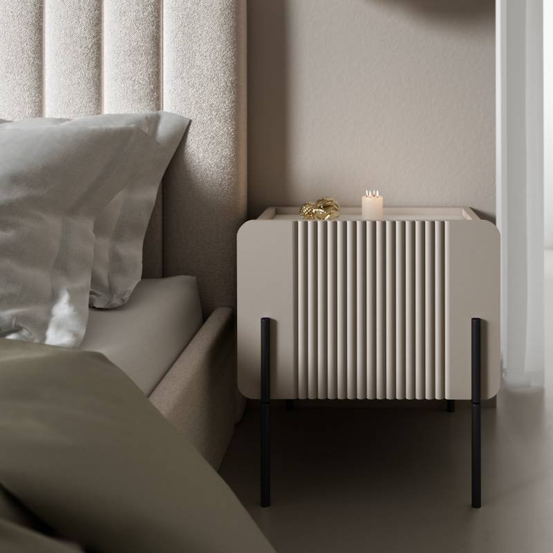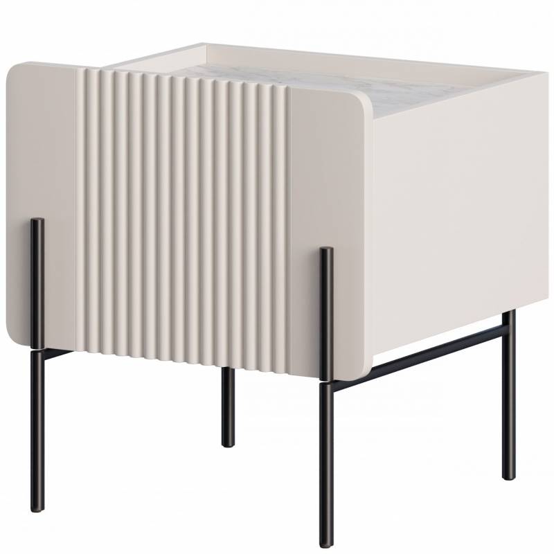 Stilingas, glamūrinio dizaino naktinis staliukas MALMI su dekoruotomis stalčiaus durelėmis. Švelnios kašmyro spalvos su kontrastuojančiomis moderniomis juodomis kojelėmis.