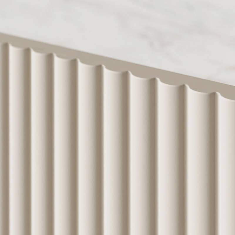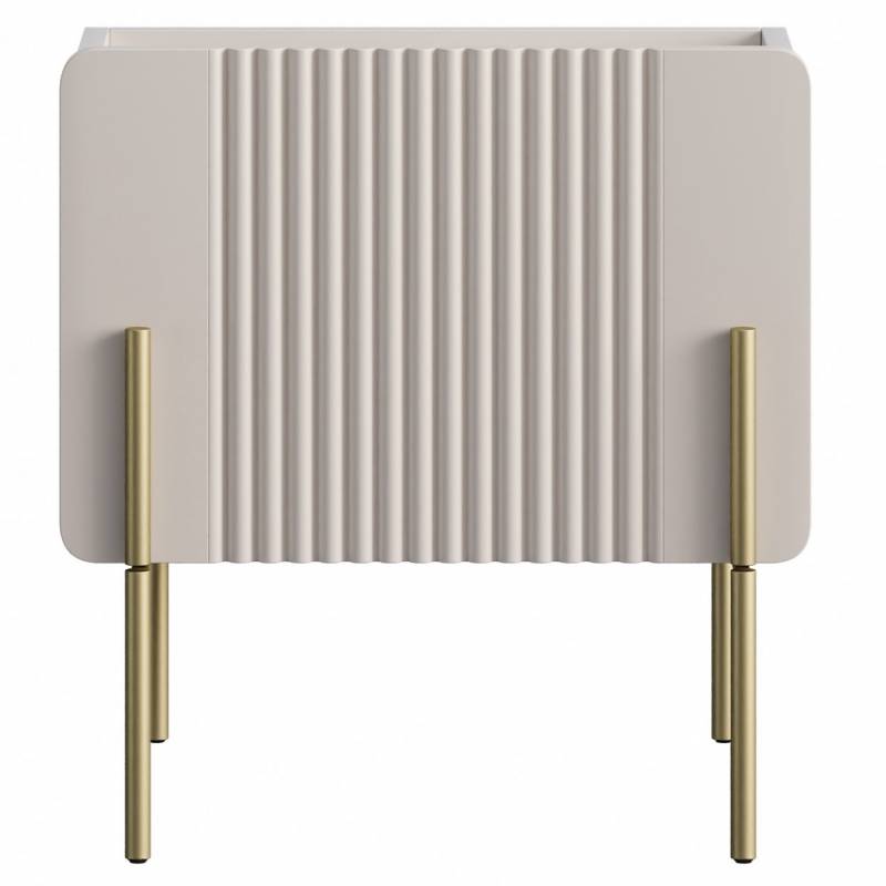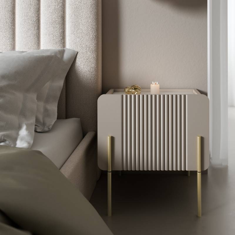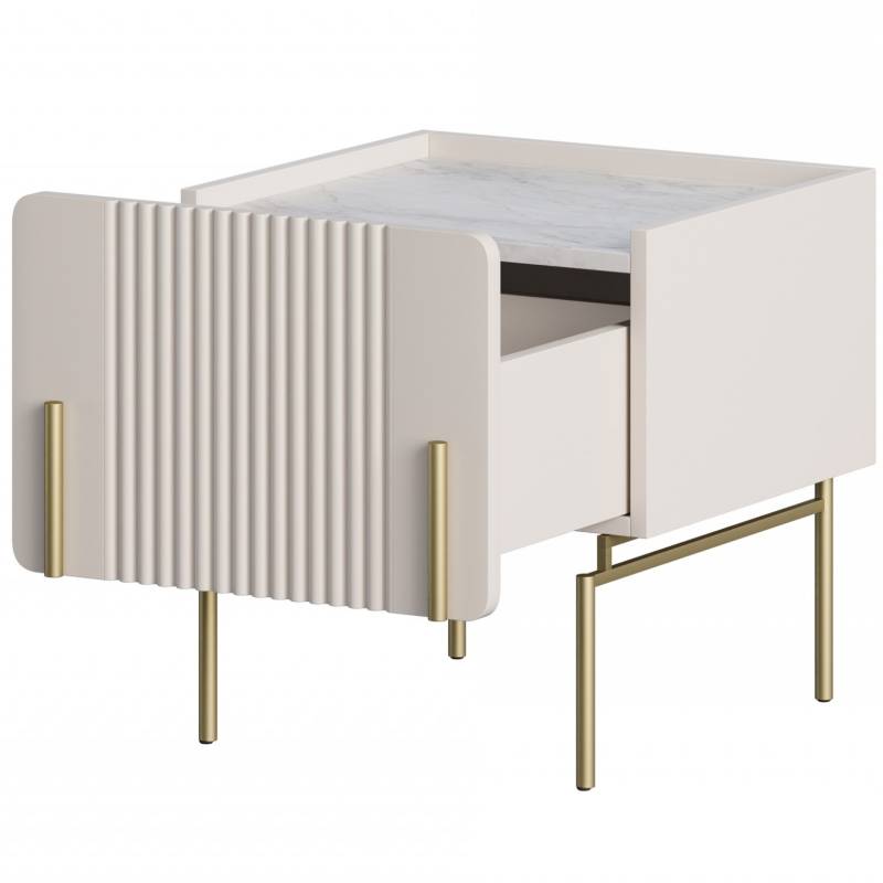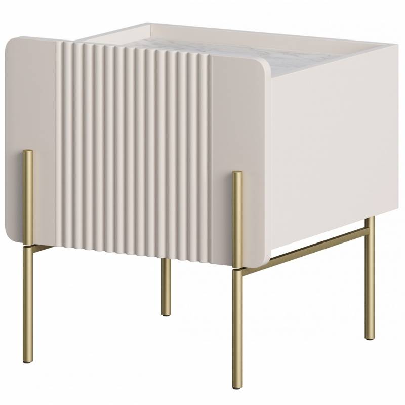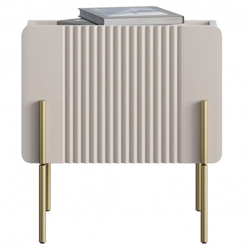 Stilingas, glamūrinio dizaino naktinis staliukas MALMI su dekoruotomis stalčiaus durelėmis. Švelnios kreminės spalvos su kontrastuojančiomis moderniomis auksinėmis kojelėmis.