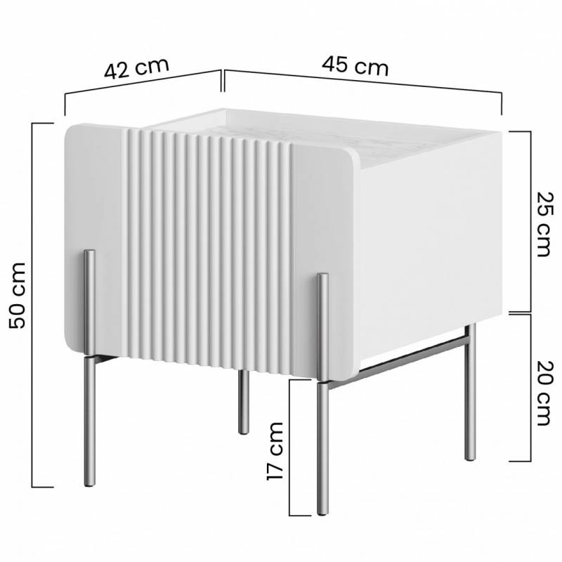Puošnus naktinis staliukas MALMI su stalčiumi, kuriame galėsite laikyti įvairius daiktus ir smulkmenas. Kreminės spalvos, su puoštomis stalčiaus durelėmis. Konstrukcija iš 16 mm laminuotos plokštės. Kojos auksinės, iš metalo. Turi tylaus uždarymo mechanizmą.