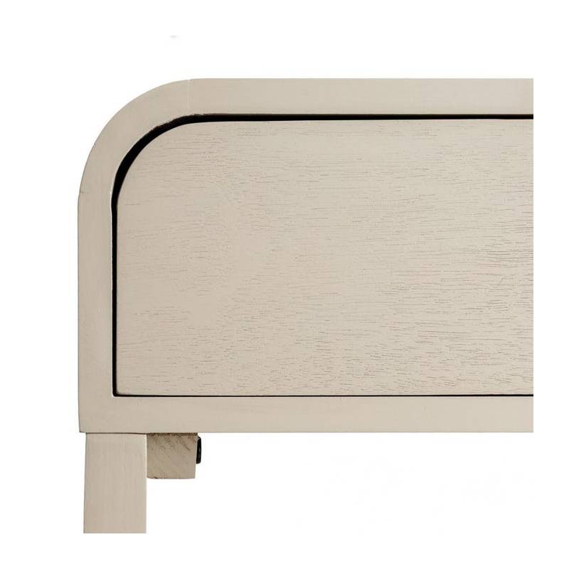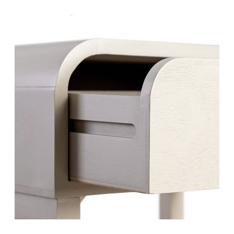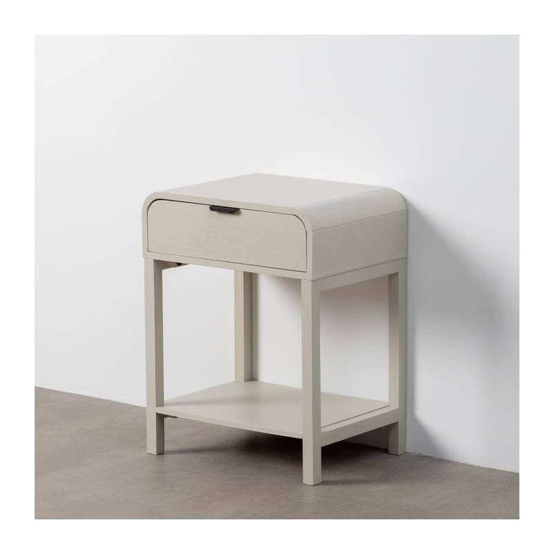 Šviesiai pilkas staliukas su mediniu rėmu ir stalčiuku – elegantiška, praktiška ir jauki detalė prie lovos.