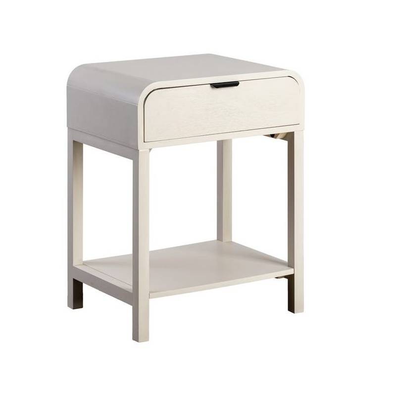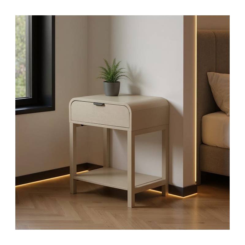 MINGA – minimalistinio dizaino naktinis staliukas, išsiskiriantis šviesiu MDF paviršiumi ir subtilia medžio struktūra. Jis turi stalčiuką, kuris puikiai tinkamas laikyti būtiniausius daiktus prieš miegą. Šviesiai pilka spalva kartu su mediniu rėmu suteikia šilumos ir elegancijos pojūtį jūsų miegamajam. Kompaktiški išmatavimai (48 × 35,5 × 61 cm) leidžia lengvai pritaikyti šį staliuką net nedidelėje erdvėje. Jis – stilingas ir funkcionalus sprendimas praktiškam interjerui.