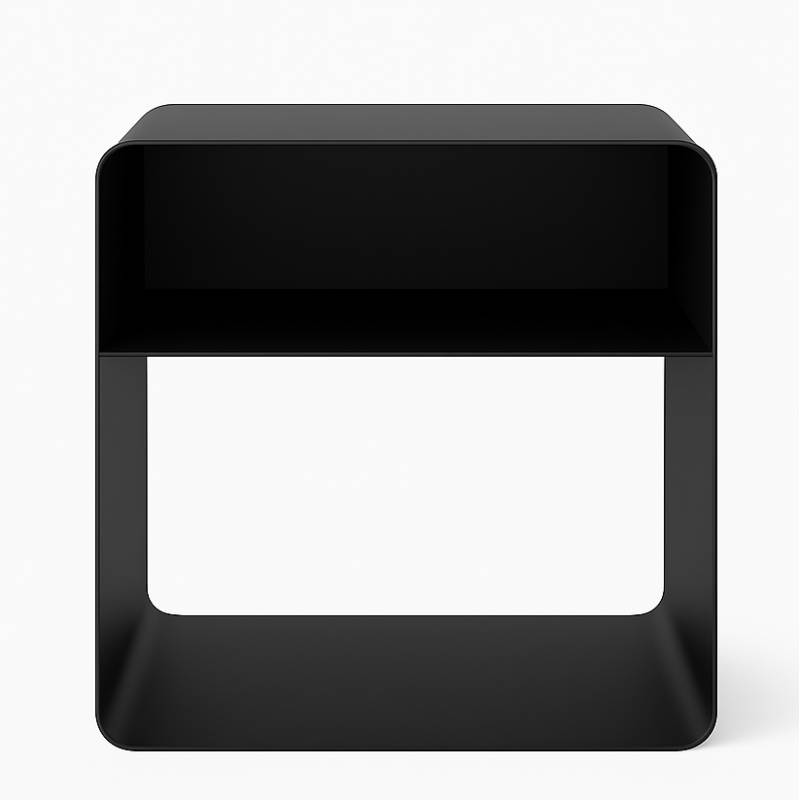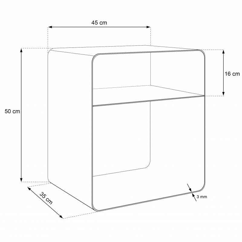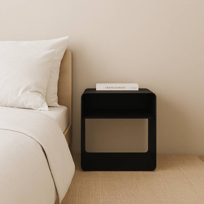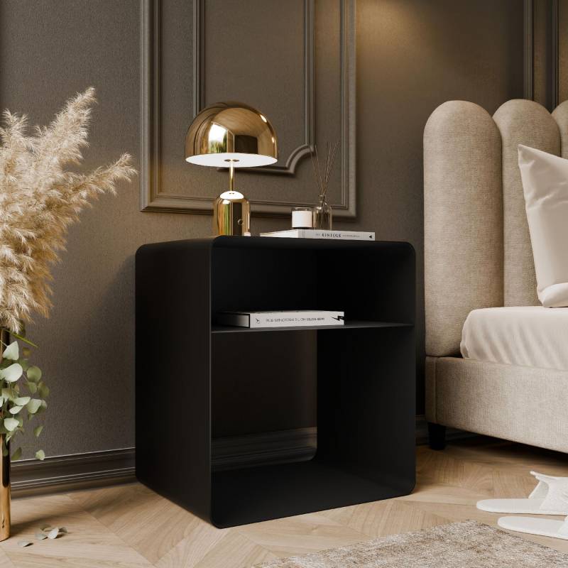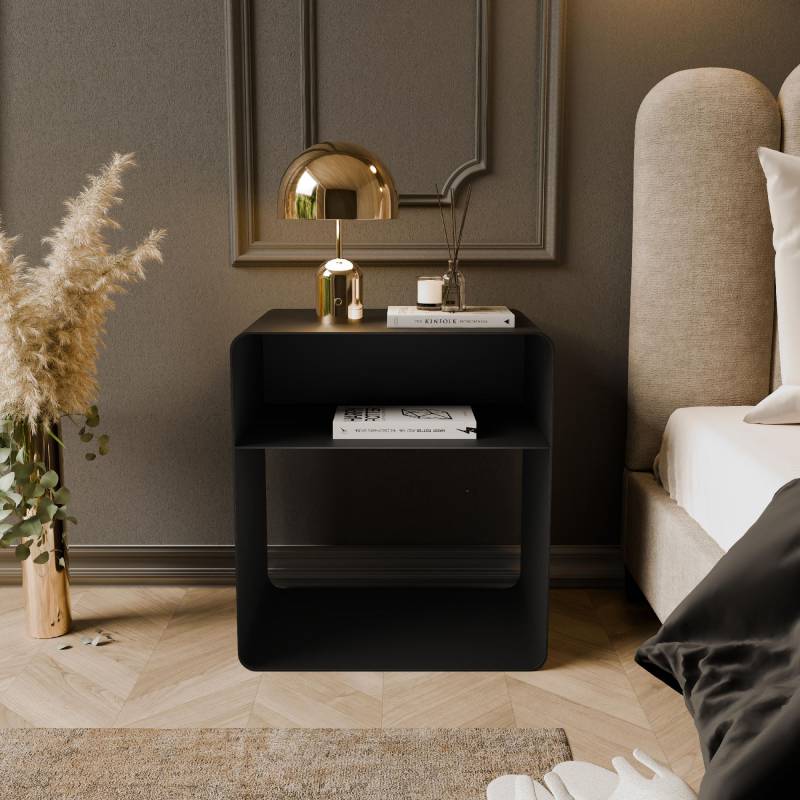 NIBRU naktinė spintelė – modernus ir minimalistinis staliukas prie lovos, pagamintas iš tvirto metalo, suteikiantis erdvei lengvumo ir elegancijos.