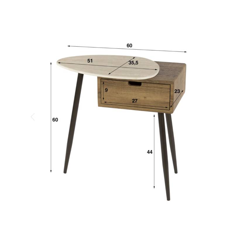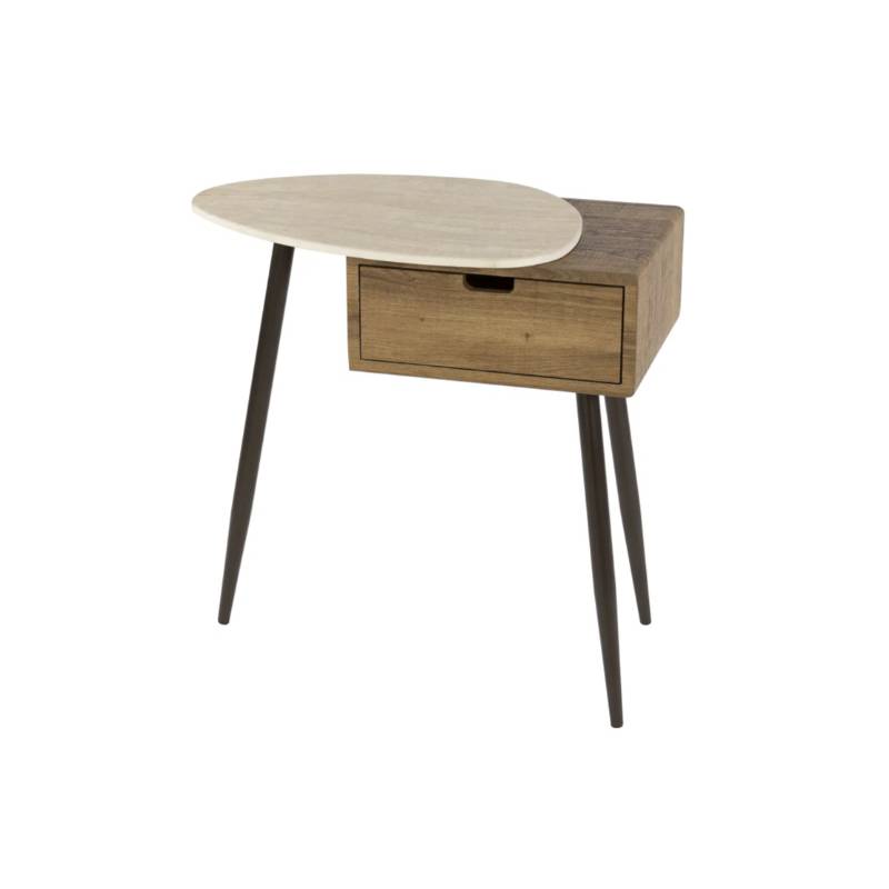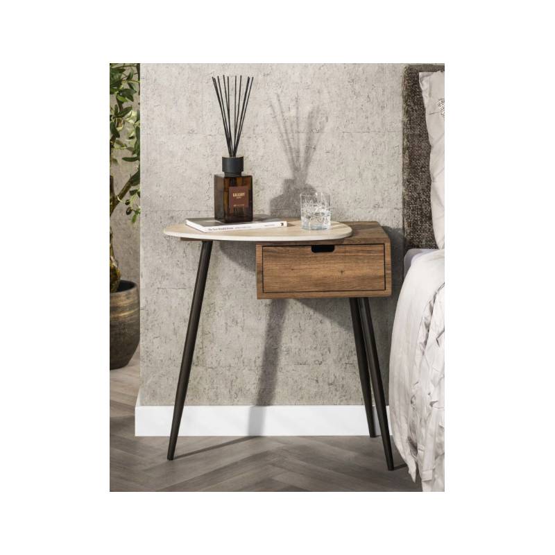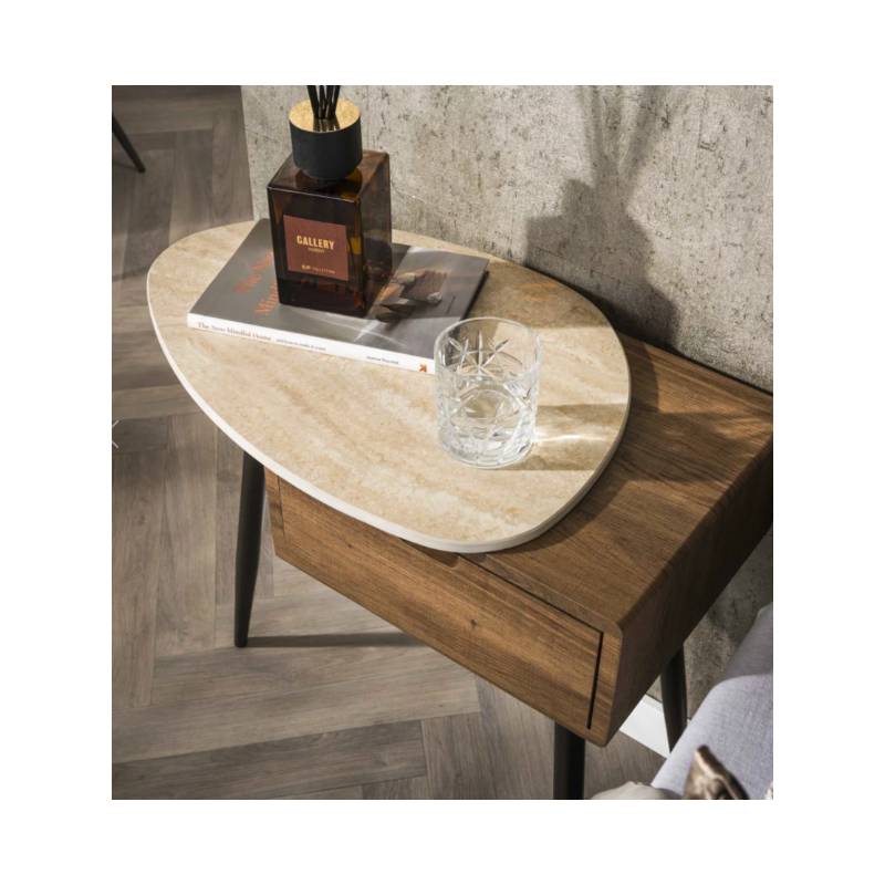 Stilingas naktinis staliukas su travertino imitacijos keraminiu stalviršiu, ąžuolo apdailos stalčiumi ir bronzos spalvos metalinėmis kojomis.