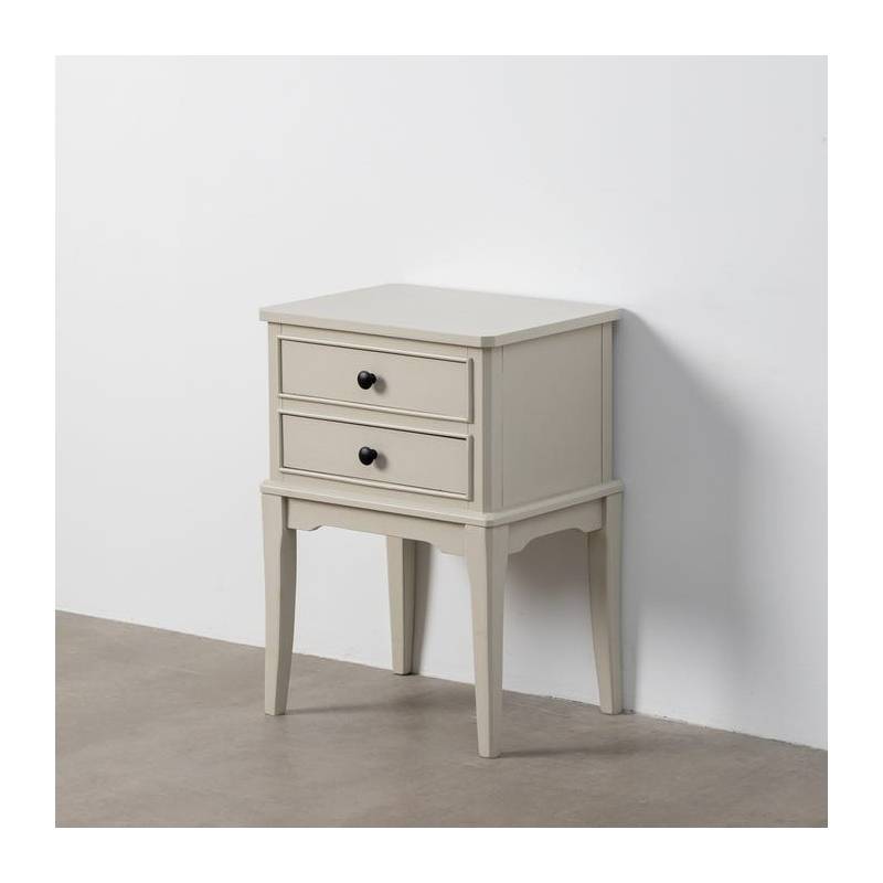 Elegantiškas šviesiai pilkas naktinis staliukas su stalčiukais ir mediniu rėmu – minimalistinis ir funkcionalus interjero sprendimas.