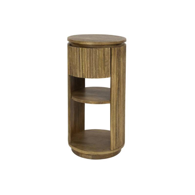 Apvalus naktinis staliukas su banguotu raštu, mango mediena ir smėlio spalvos apdaila, funkcionalus ir stilingas.