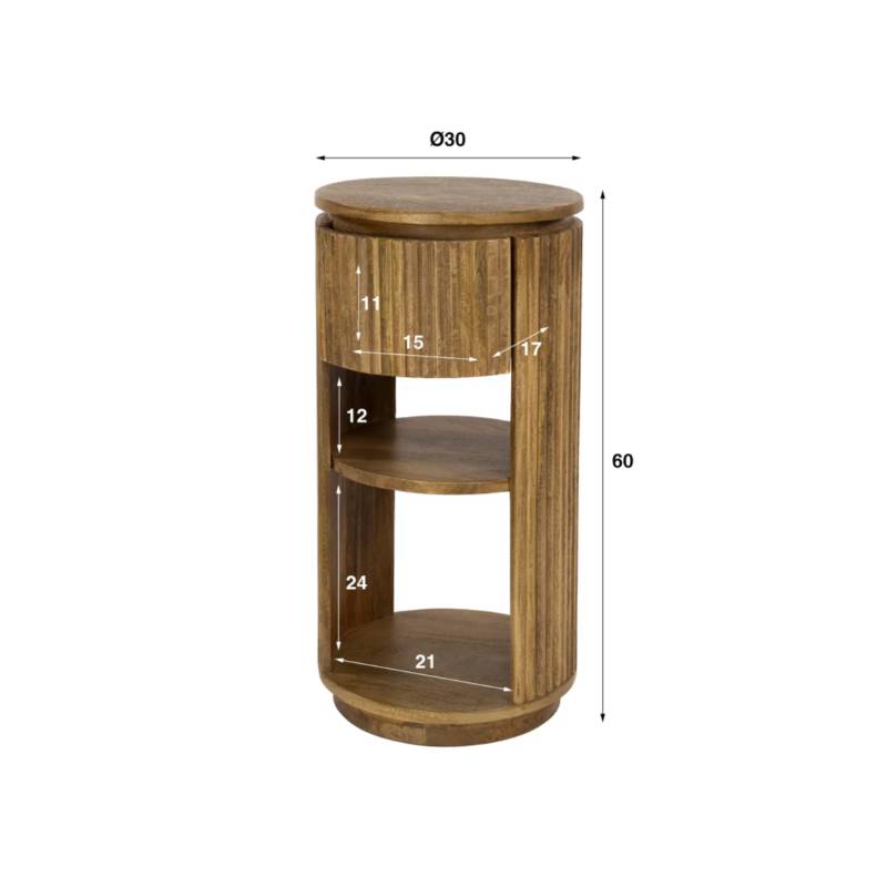 WAVO naktinis staliukas pagamintas iš tvirtos mango medienos ir pasižymi šilta smėlio spalvos apdaila, kuri suteikia interjerui jaukumo. Apvali forma ir visą perimetrą apimantis vertikalus bangų raštas kuria išskirtinį, šiuolaikišką dizainą.