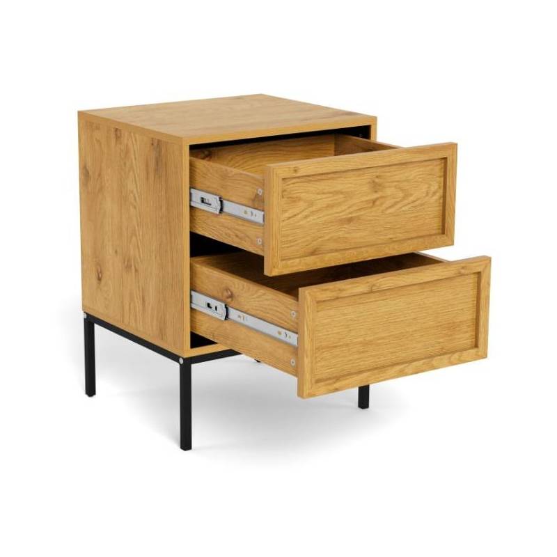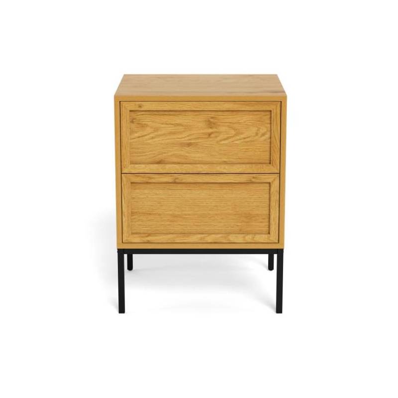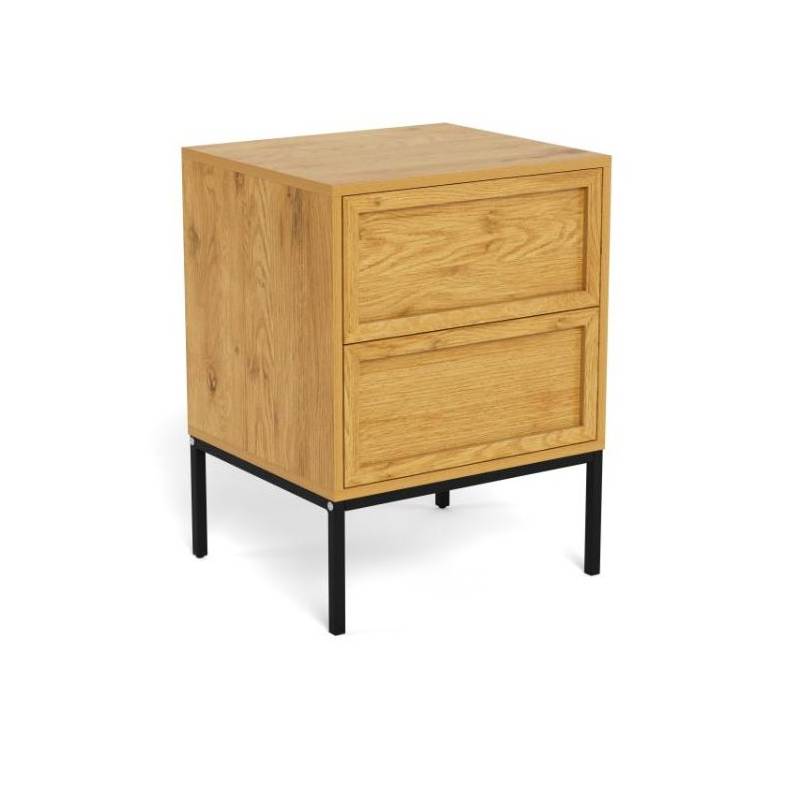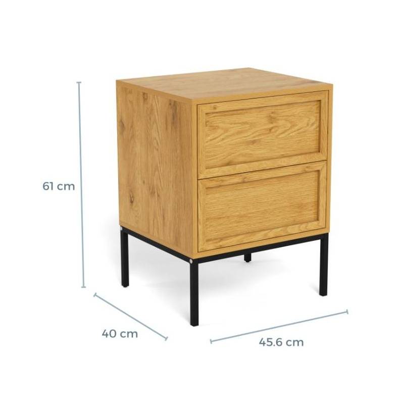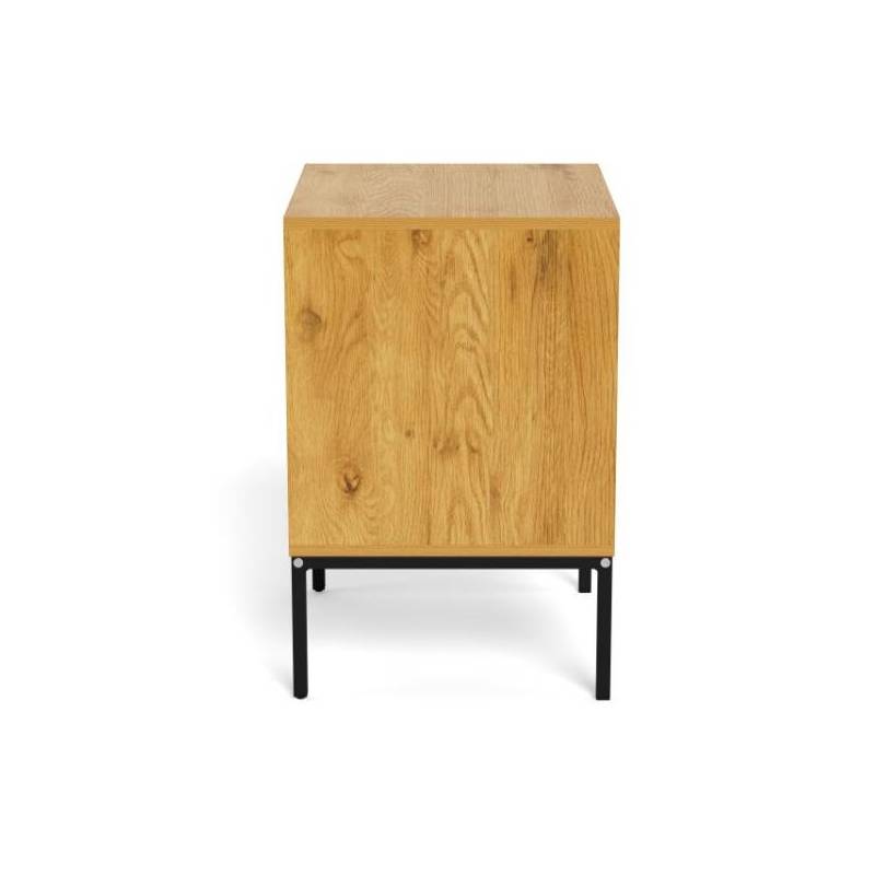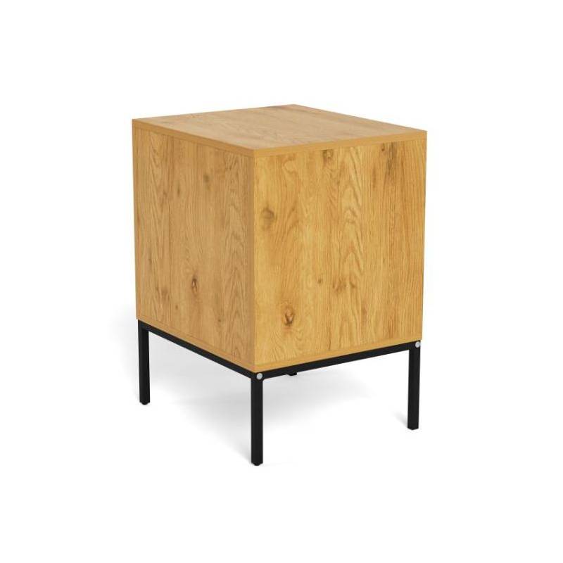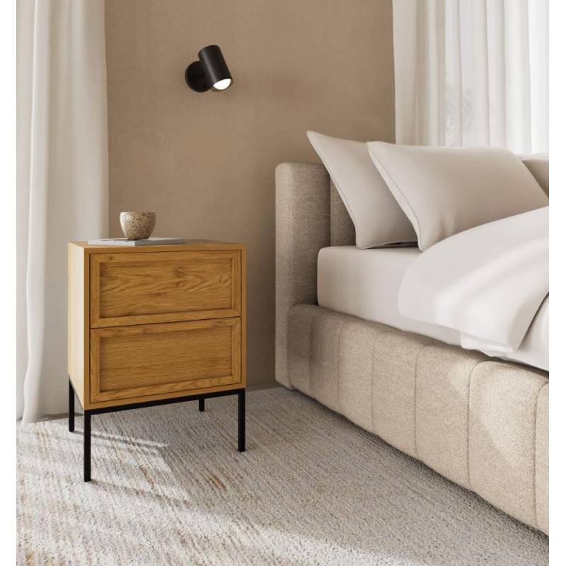 Stačiakampis naktinis staliukas pasižymi šiuolaikišku dizainu ir natūralią medieną primenančiu paviršiumi, kuris suteikia interjerui šilumos bei jaukumo. Tamsus metalinis pagrindas sukuria subtilų kontrastą ir pabrėžia modernų baldo charakterį, todėl jis lengvai pritaikomas įvairiuose miegamojo interjeruose.