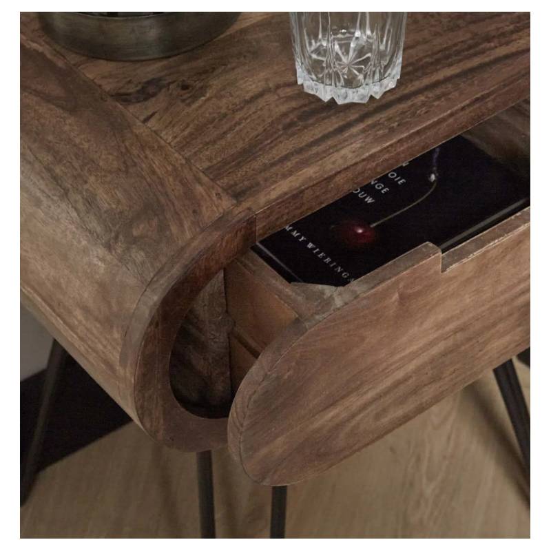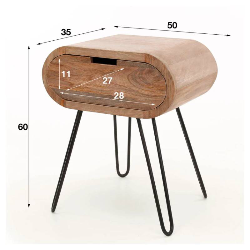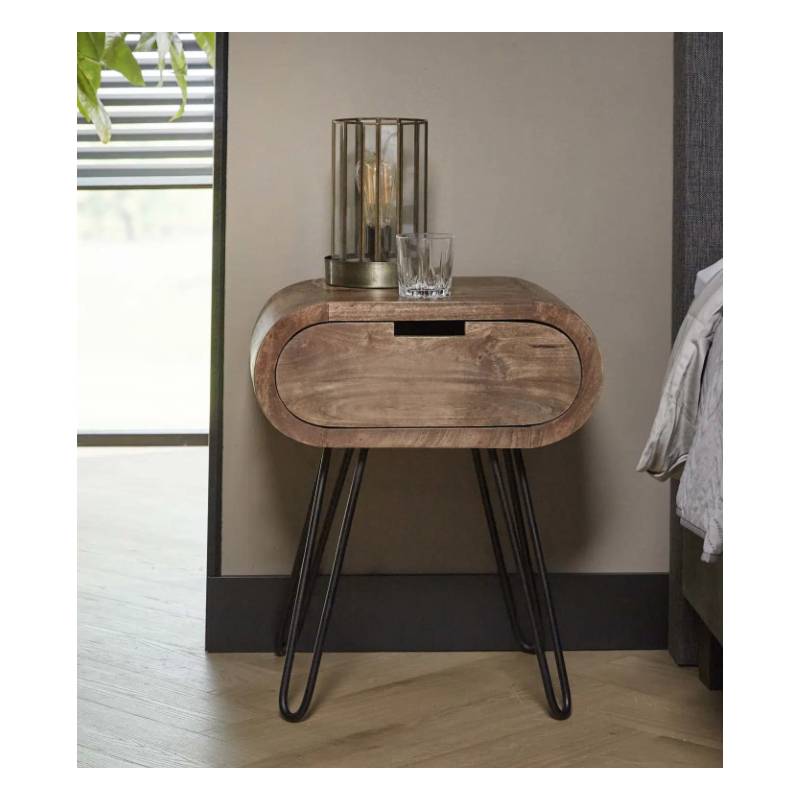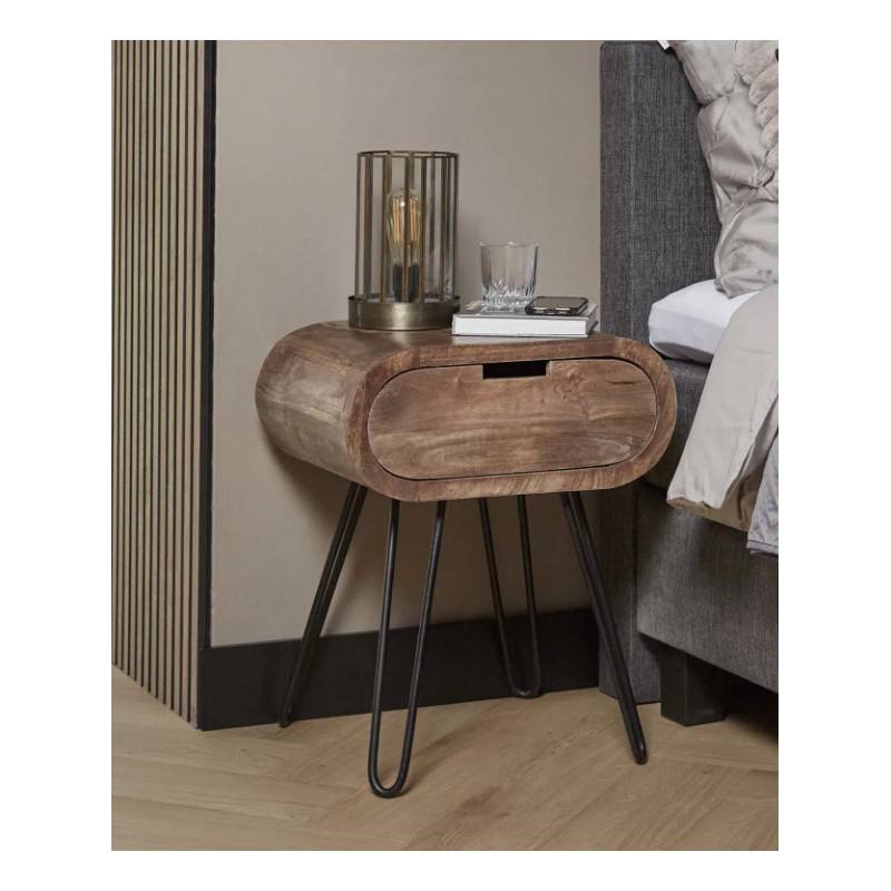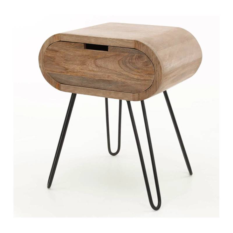 Apvalus naktinis staliukas su mango mediena, smėlio spalvos apdaila ir juodu metaliniu rėmu, modernus ir funkcionalus.