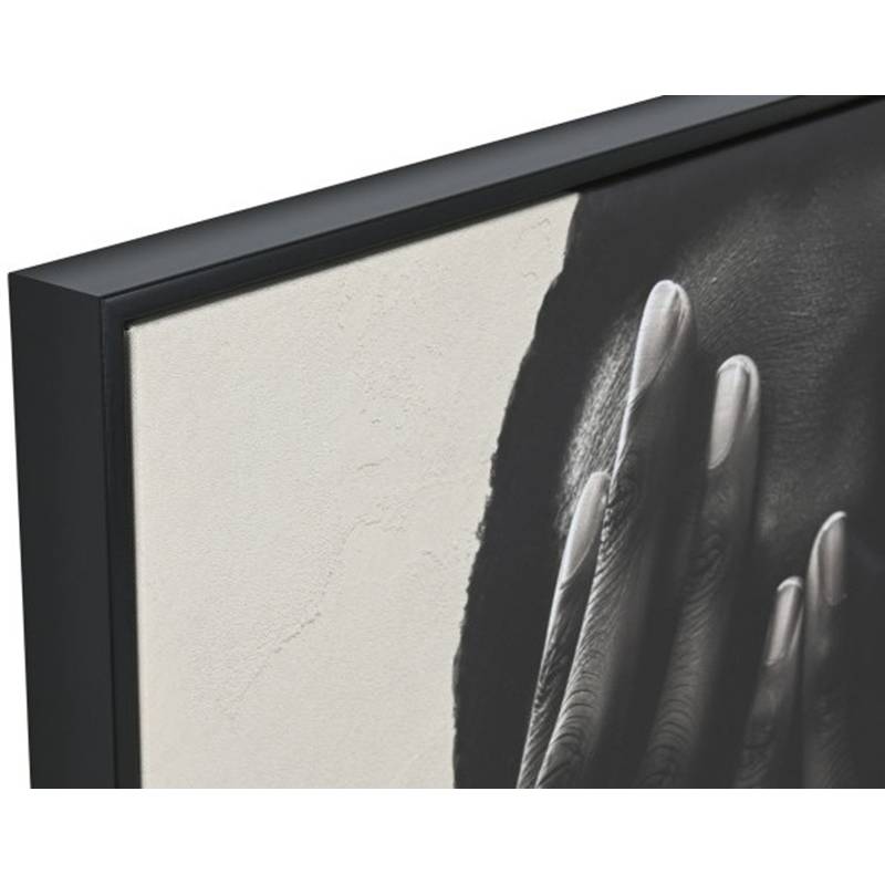 Paveiksle HANDS vaizduojamas juodaodis, užsidengęs veidą rankomis. Tarsi nuo veido nukreipdamas dėmesį į papuošalus, kuriais gausiai puoštos jo rankos. Masyvios apyrankės ir žiedas – sidabro spalvos. Paveikslas stačiakampio formos, su juodos spalvos plastikiniu rėmeliu. Ant nugarinės rėmelio dalies primontuotos auselės pakabinimui.