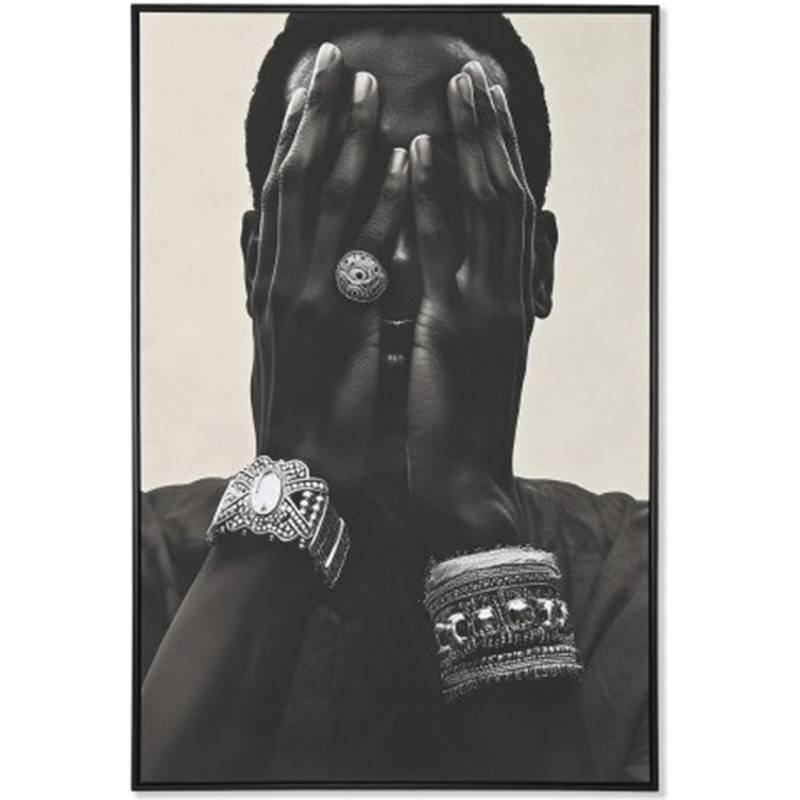 Realistinis paveikslas HANDS vaizduoja veidą rankomis užsidengusį žmogų. Afrikietiškos temos paveiksle akį traukia masyvūs aksesuarai.