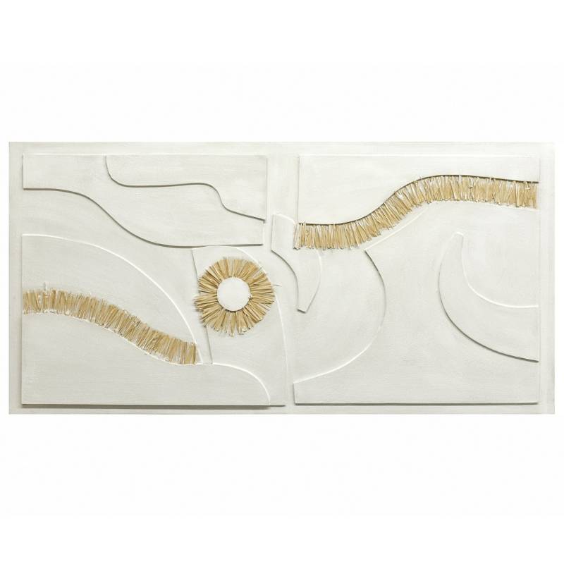 MOTIVOS paveikslas išsiskiria abstrakčia kompozicija ir natūralios rafijos detalėmis, kurios suteikia paviršiui gylio ir išraiškingos tekstūros. Švelnūs baltos, beige ir ochros atspalviai kuria ramią, harmoningą nuotaiką, lengvai derančią prie modernaus, japandi ar natūralaus stiliaus interjerų. Tai dekoratyvus akcentas, kuris ne tik puošia sieną, bet ir suteikia erdvei jaukumo bei organiškumo.
