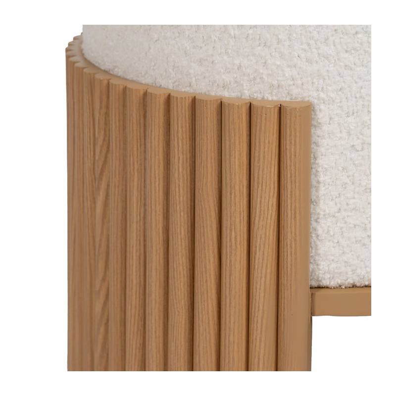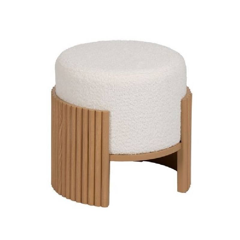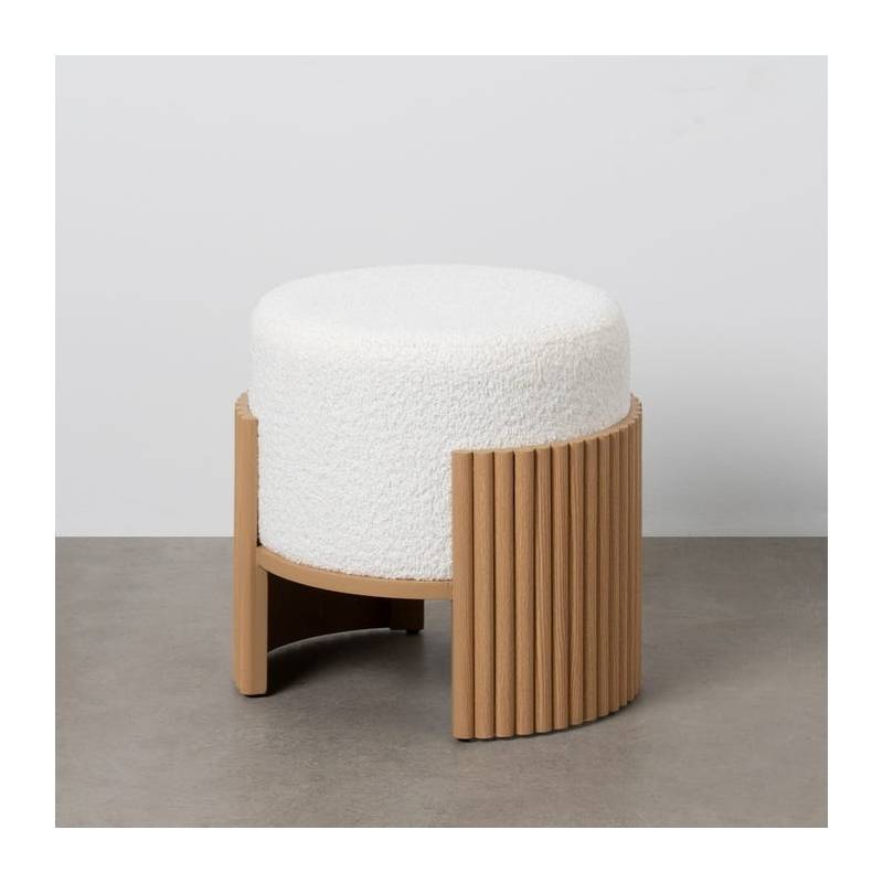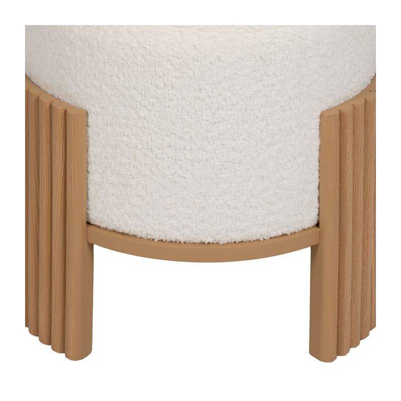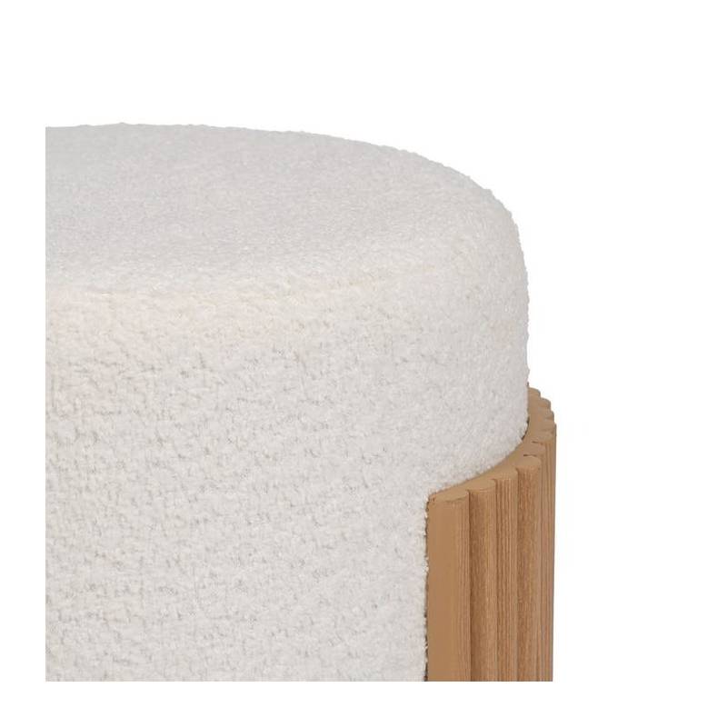 Išskirtinis pufas GROOVE pasižymi šiuolaikiškumu ir dizaino estetika. Minkšta sėdimoji dalis apvilkta baltos spalvos šenilo audiniu, kuris suteikia baldui jaukumo. Kojelės pritaikytos prie apvalios pufo formos, priekis dekoruotas grioveliais su natūralaus medžio raštais ir natūralia medžio spalva.