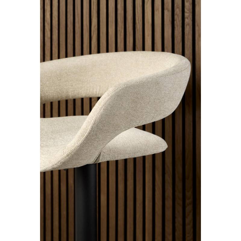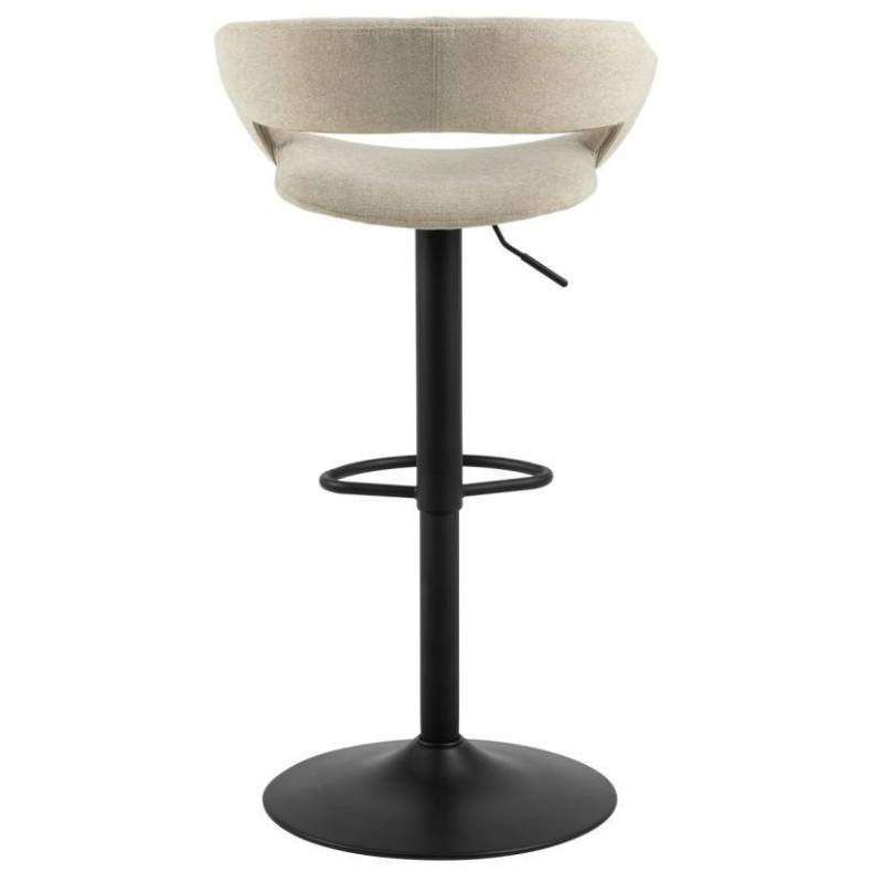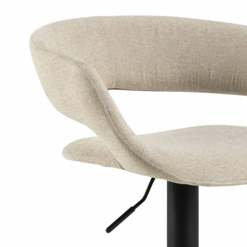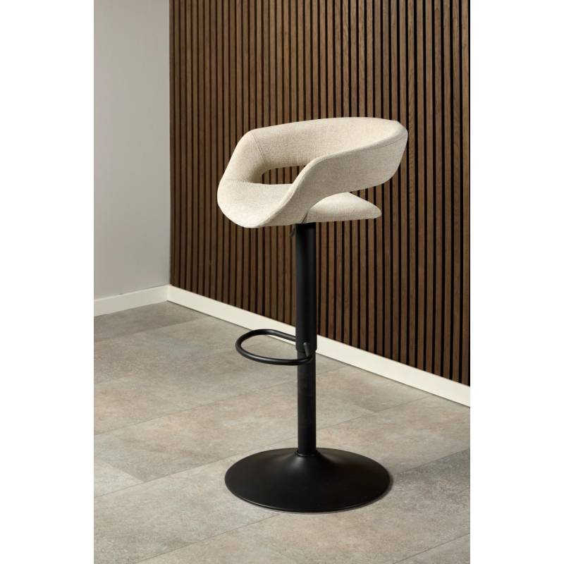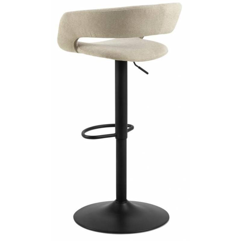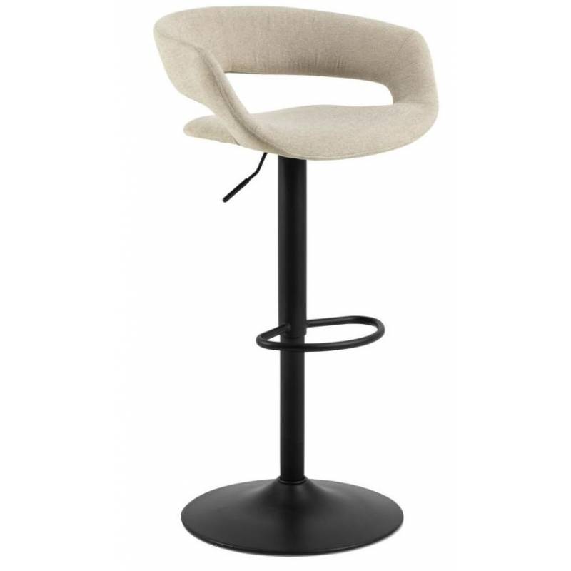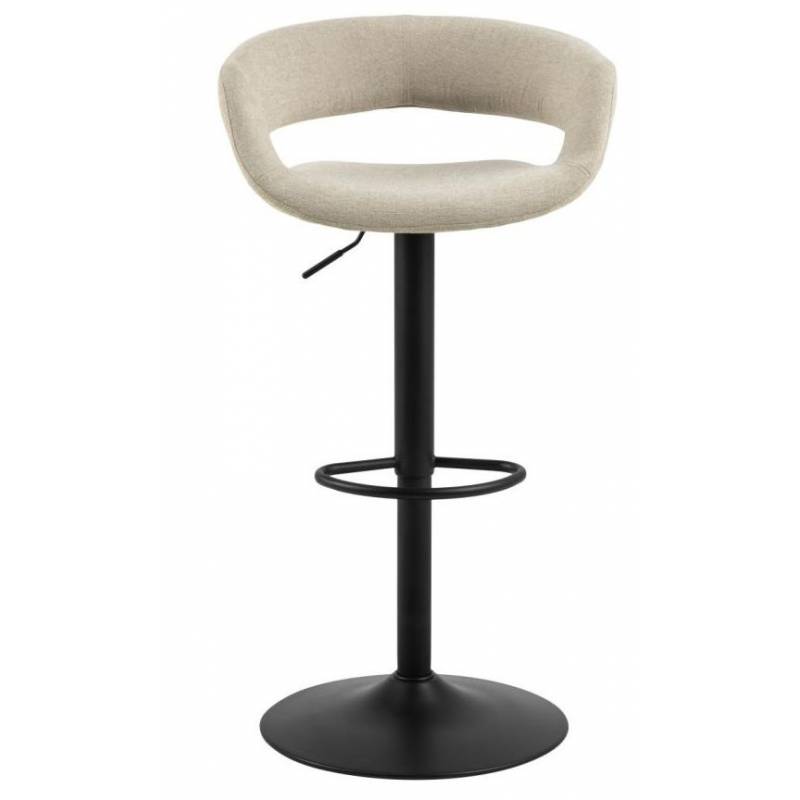 Stilinga pusbario kėdė, kuri dera prie įvairių interjerų. Minkšta smėlio spalvos audinio sėdynė suteikia jaukumo, o medžio imitacijos rėmas prideda natūralumo pojūtį. Patogi atrama kojoms užtikrina komfortą net ilgiau sėdint.