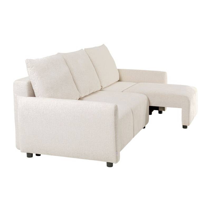 Moderni išskleidžiama sofa-lova su šviesiu kreminiu audiniu – stilingas ir patogus baldas kasdieniam poilsiui ar svečių nakvynei.