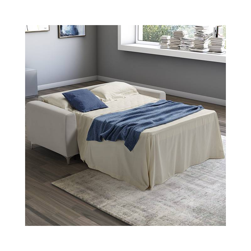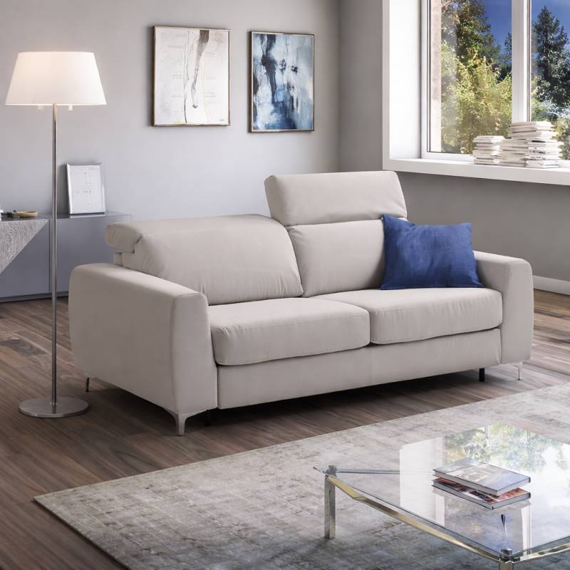 Stilinga apvali sofa-lova su integruotu čiužiniu, lengvai išverčiama į lovą. Elegantiška ir praktiška, tinkanti kasdieniam poilsiui ir svečiams.