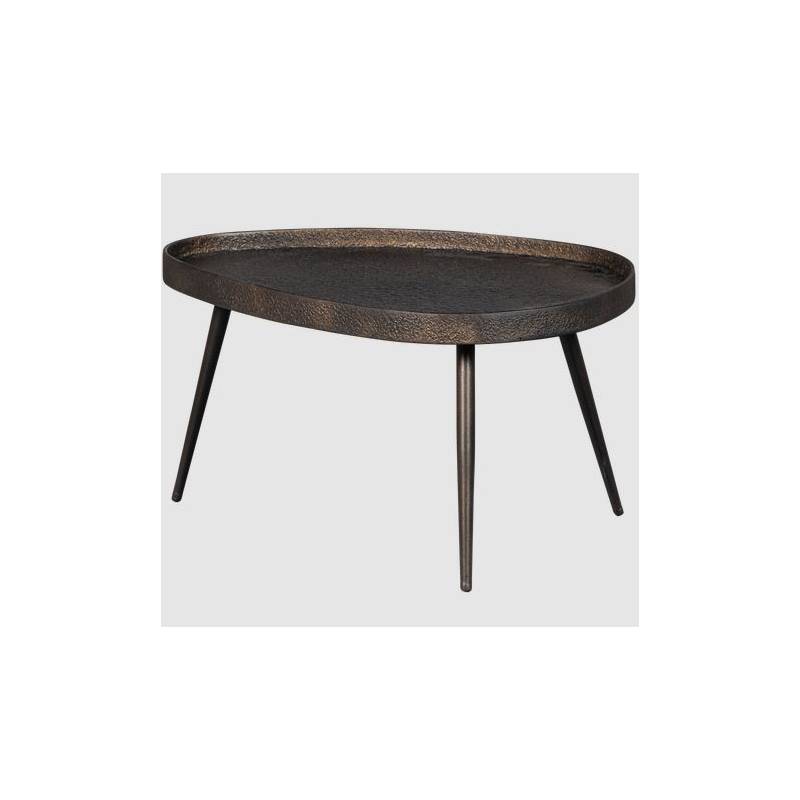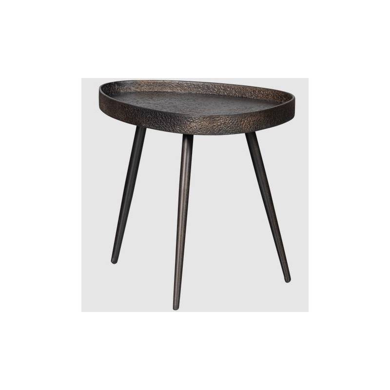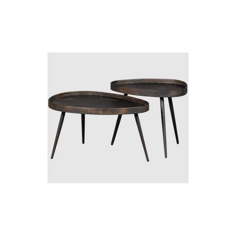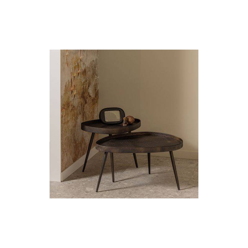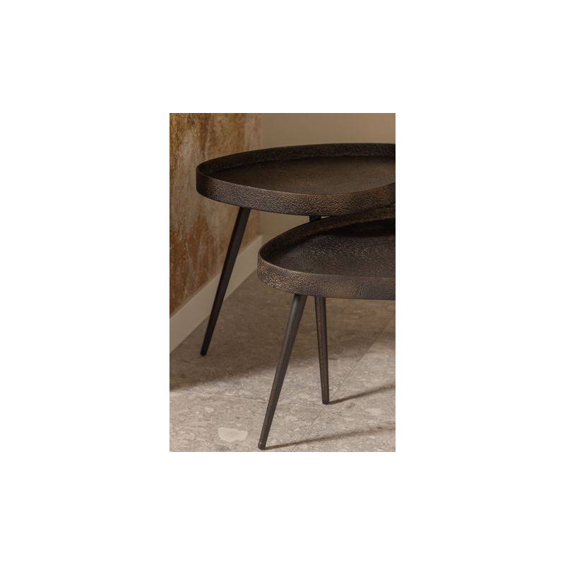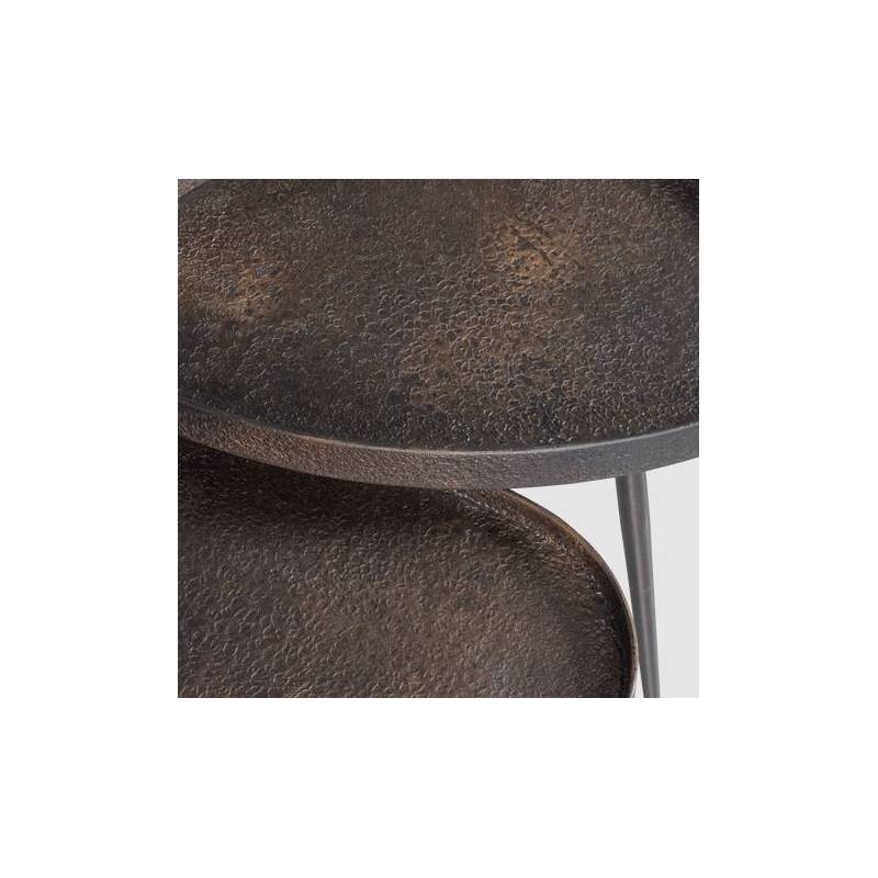 Šoninių staliukų komplektas CRUDO su spaustos faneruotės stalviršiu, kuris padengtas cinkuotu metalu. Spalva juoda su rudu, aukso/bronzos atspalviais. Kojelės metalinės. Staliukų matmenys: