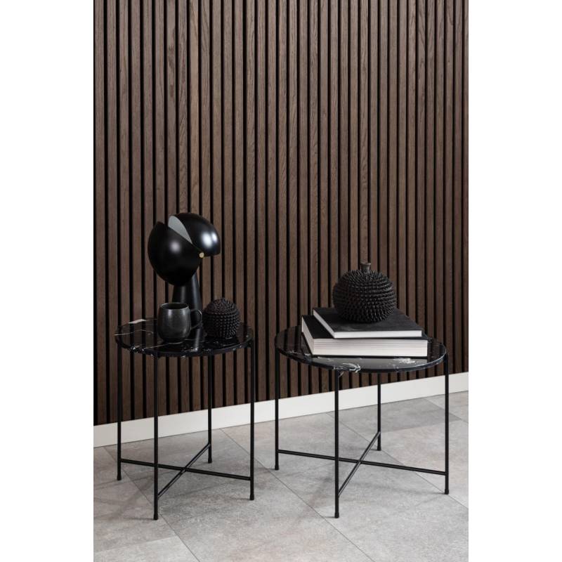 Šis šoninis staliukas išsiskiria elegantiška juodo marmuro išvaizda ir tvirtu plieno rėmu. Poliruotas marmuro paviršius atrodo prabangiai, o jo unikalūs raštai suteikia kiekvienam staliukui išskirtinumo. Juodos spalvos plieninis rėmas su matine milteline danga suteikia stabilumo bei ilgaamžiškumo, o minimalistinė forma leidžia staliukui puikiai įsilieti į modernų ar industrinį interjerą. Kompaktiški išmatavimai leidžia patogiai naudoti staliuką šalia sofos ar fotelio – jis idealiai tinka tiek gėrimams, tiek dekoratyviems aksesuarams. Tai funkcionalus ir kartu dekoratyvus baldas, pabrėžiantis jūsų interjero stilių.