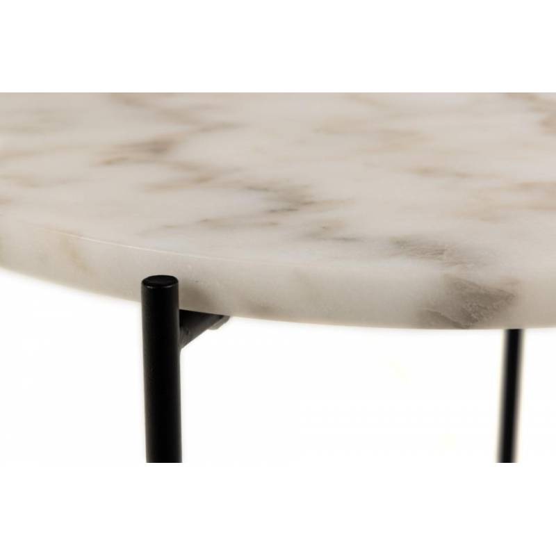Šis šoninis staliukas išsiskiria subtiliu dizainu ir kokybiškų medžiagų deriniu. Natūralus baltas Guangxi marmuras suteikia paviršiui prabangos bei unikalumo, nes kiekvienas marmuro raštas yra išskirtinis. Juodos spalvos plieninis rėmas su matine milteline danga užtikrina stabilumą ir tvirtumą, o minimalistinės formos leidžia staliukui harmoningai derėti prie įvairių interjero stilių. Dėl savo kompaktiško dydžio šis baldas idealiai tinka šalia sofos ar fotelio – patogiai pasidėti knygą, gėrimą ar dekoratyvų aksesuarą. Tai elegantiškas interjero akcentas, jungiantis praktiškumą ir estetiką.