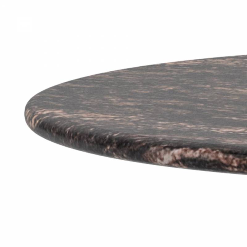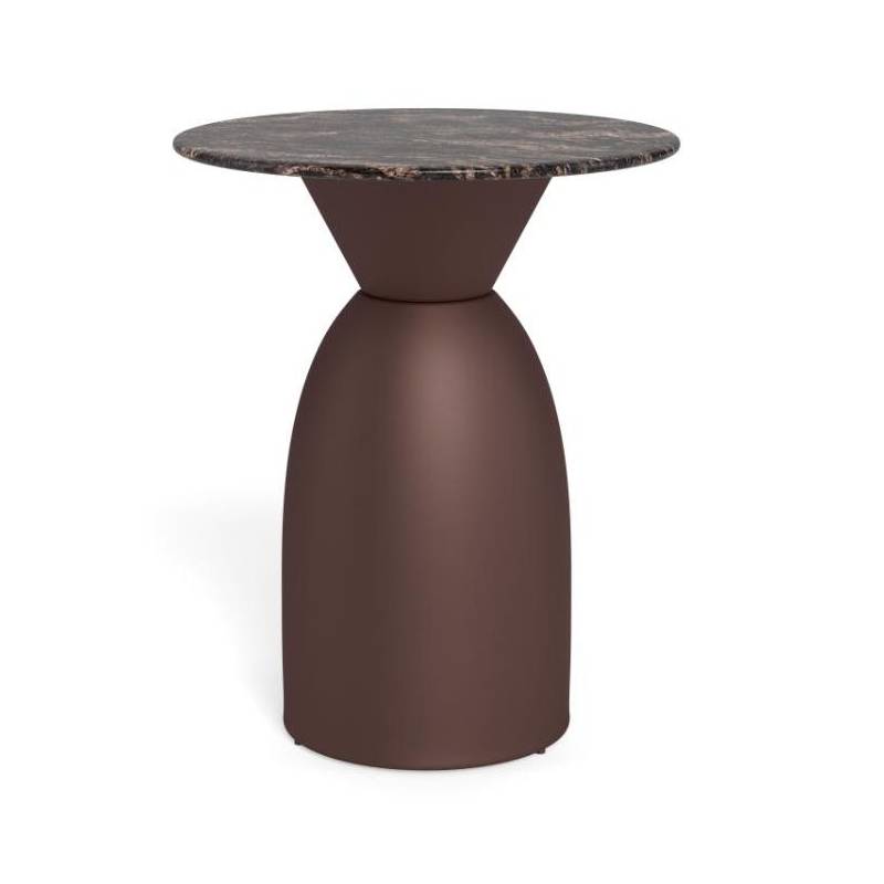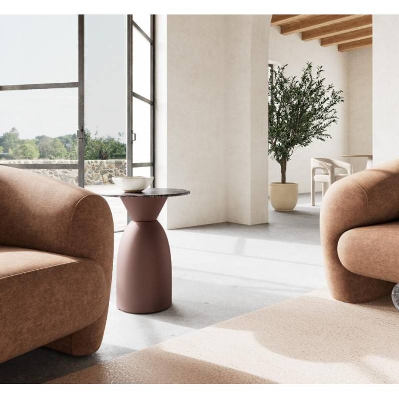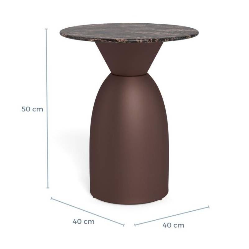Tvirtas bronzinio atspalvio metalinis pagrindas užtikrina stabilumą ir sukuria modernų, skulptūrišką įvaizdį. Apvali forma leidžia lengvai integruoti staliuką tiek svetainėje, tiek kaip papildomą akcentą šalia minkštų baldų.