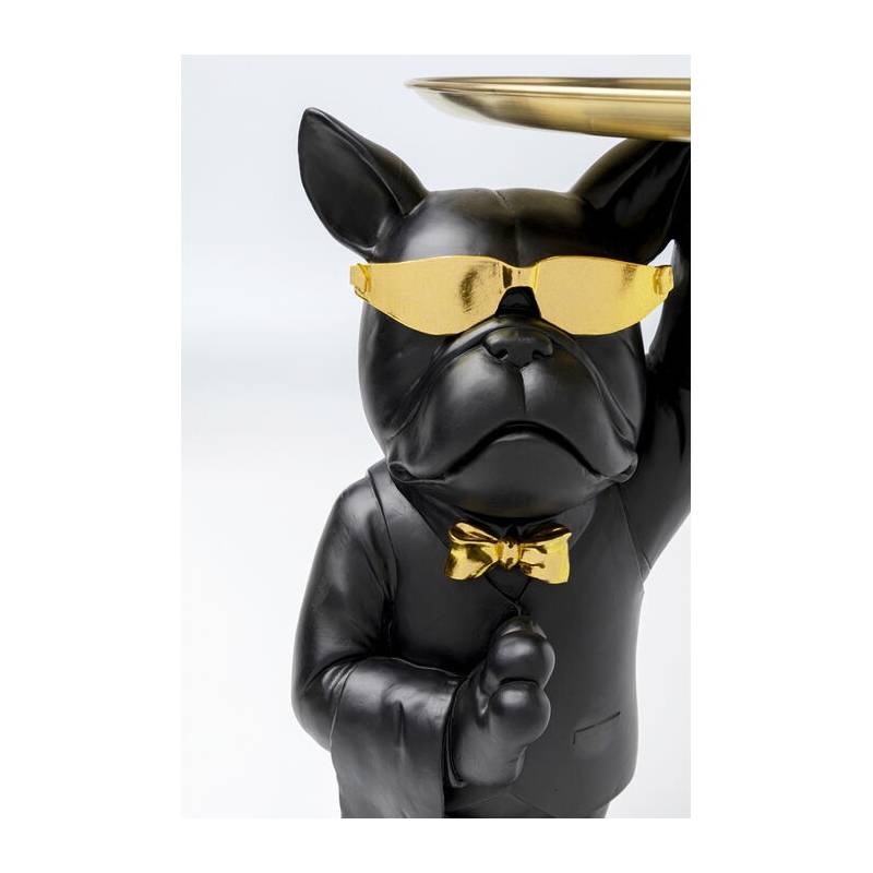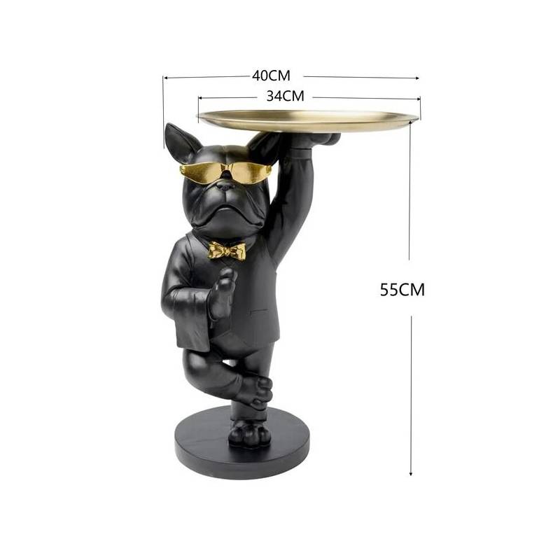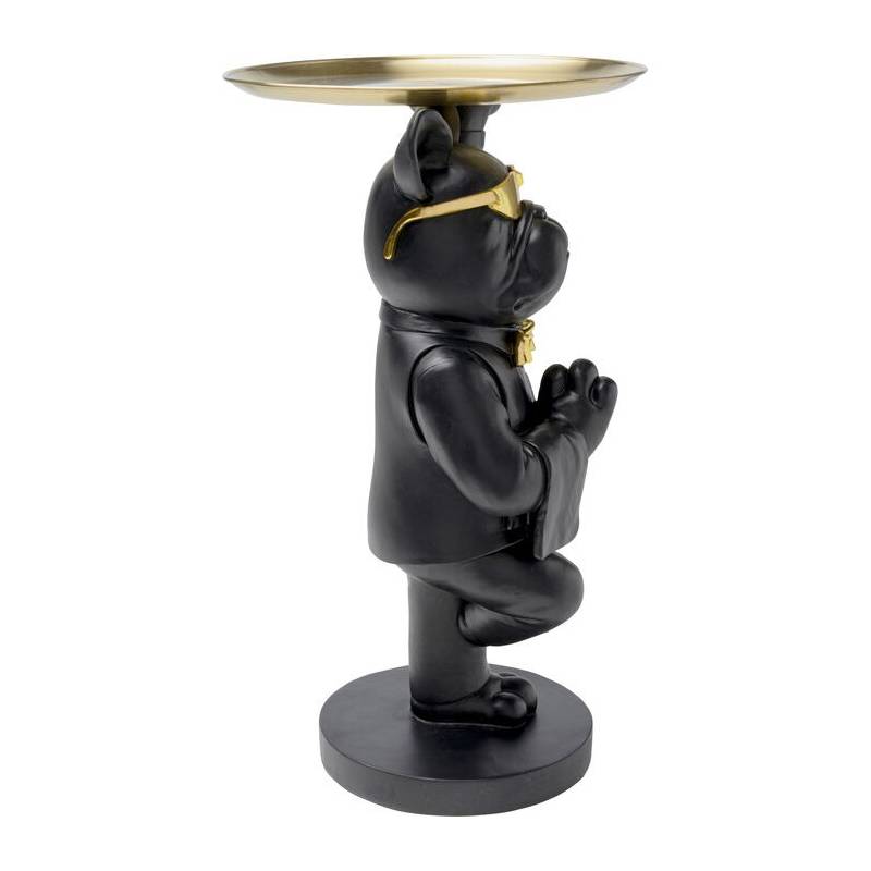 Išraiškingas šoninis staliukas su buldogo figūra ir auksiniu padėklu – žaismingas, bet elegantiškas interjero akcentas.