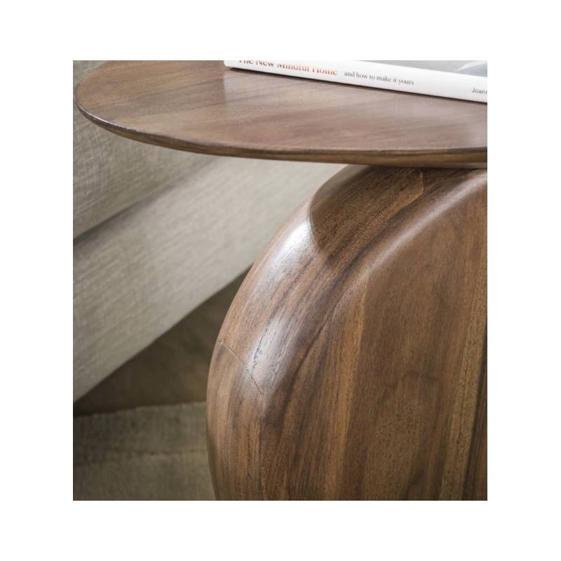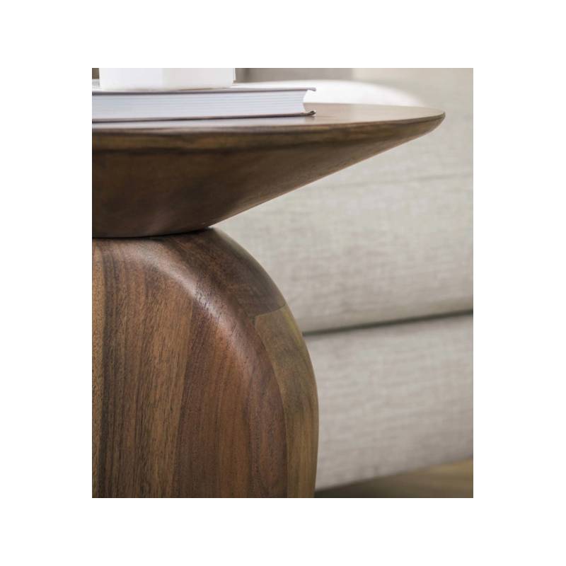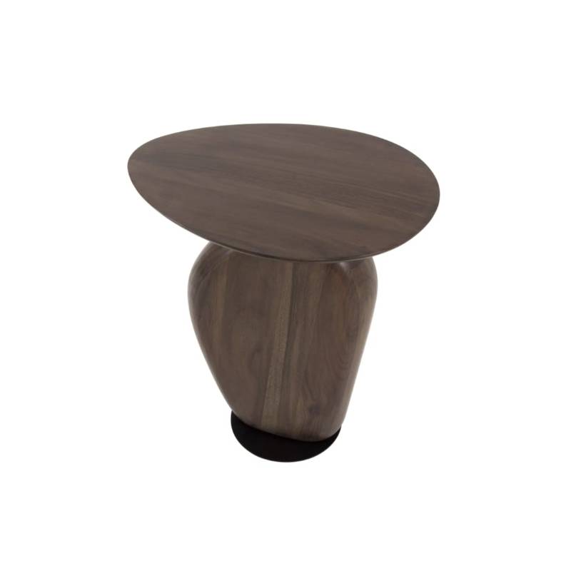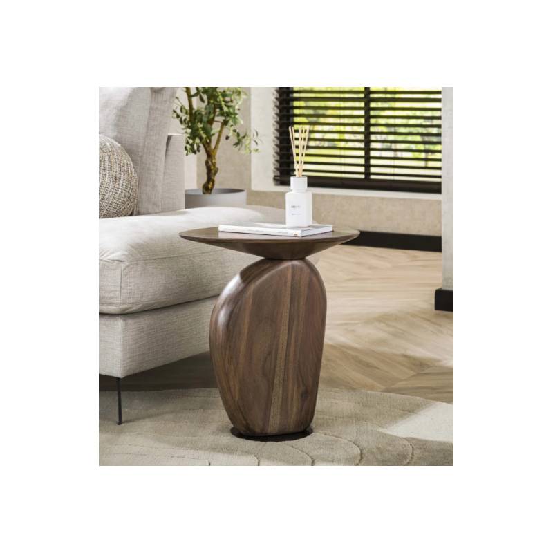 SOLIS šoninis staliukas pagamintas iš akacijos medienos, kuri pasižymi tvirtumu ir natūraliu grožiu. Matinis rudas paviršius išryškina medžio tekstūrą ir suteikia baldui šilumos, o organiškos formos stalviršis kuria gyvą ir dinamišką dizainą.