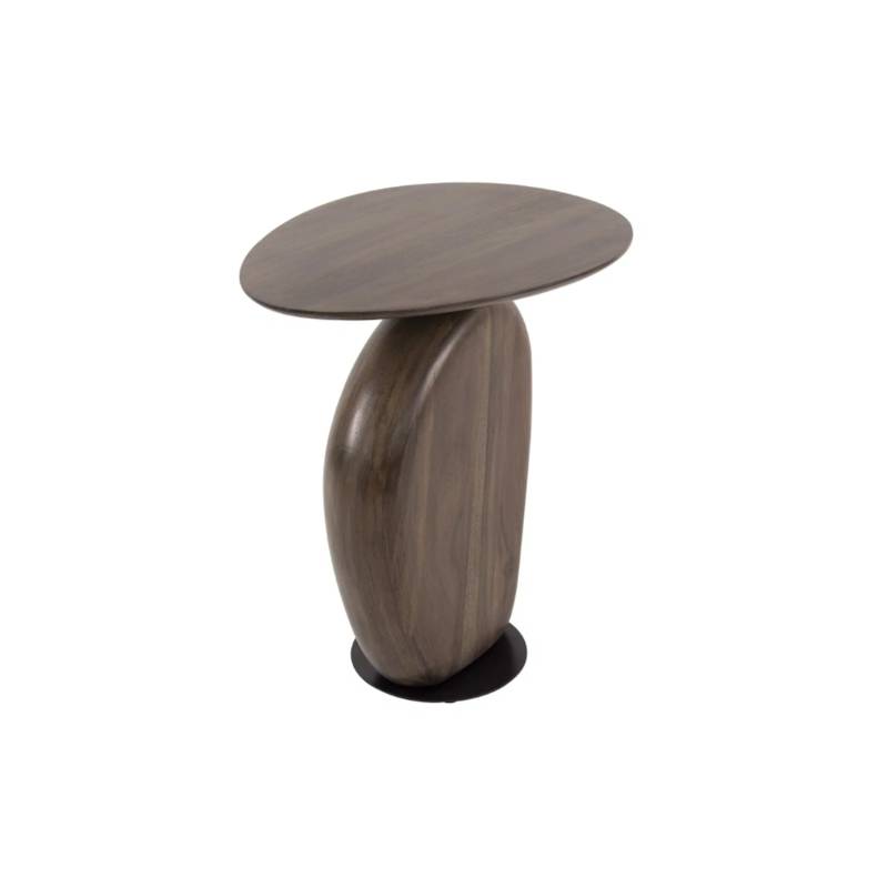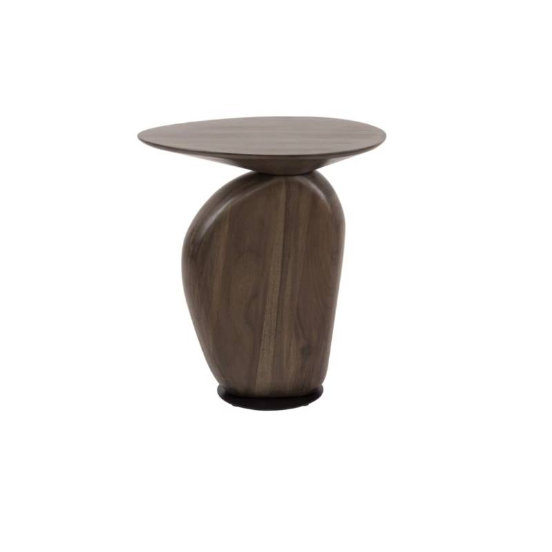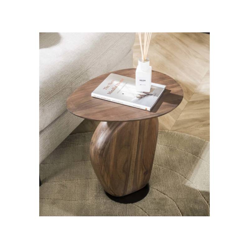 Natūralaus medžio šoninis staliukas su organiška forma ir šiltu rudu atspalviu, suteikiantis interjerui jaukumo ir išskirtinumo.