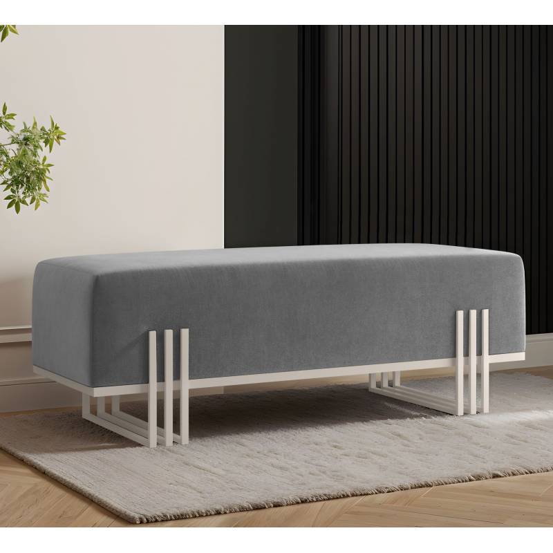 Minimalistinis suoliukas su minkšta sėdyne ir metaliniu rėmu, puikiai tinkantis prieškambariui, miegamajam ar garderobui.