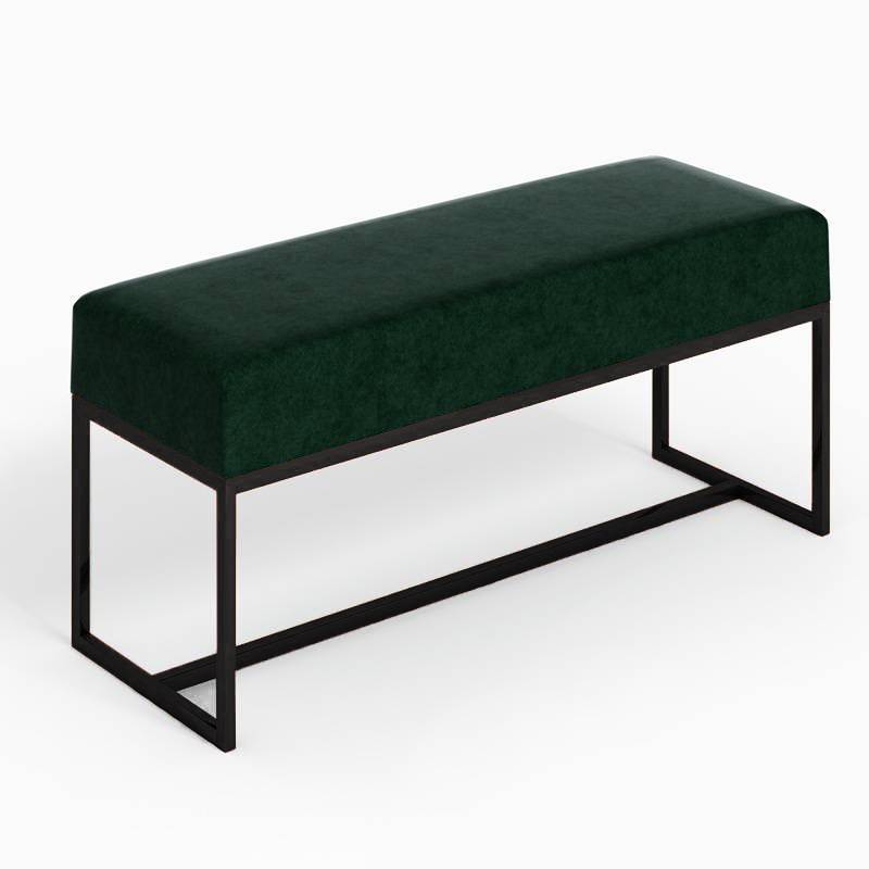 Modernaus dizaino suoliukas MONTE. Sėdimoji dalis aptraukta sodrios žalios spalvos velvetu, minkštu iš švelniu. Karkasas ir kojelės pagamintos iš juodos spalva nudažyto plieno. Spalviškai modernus ir solidus derinys.