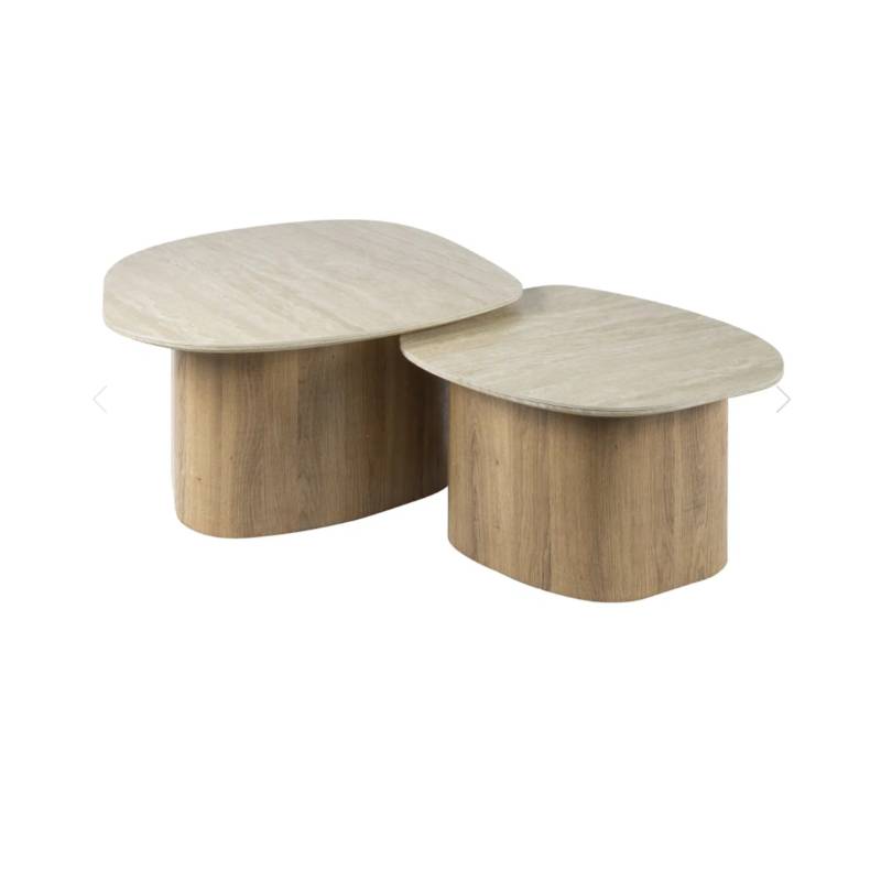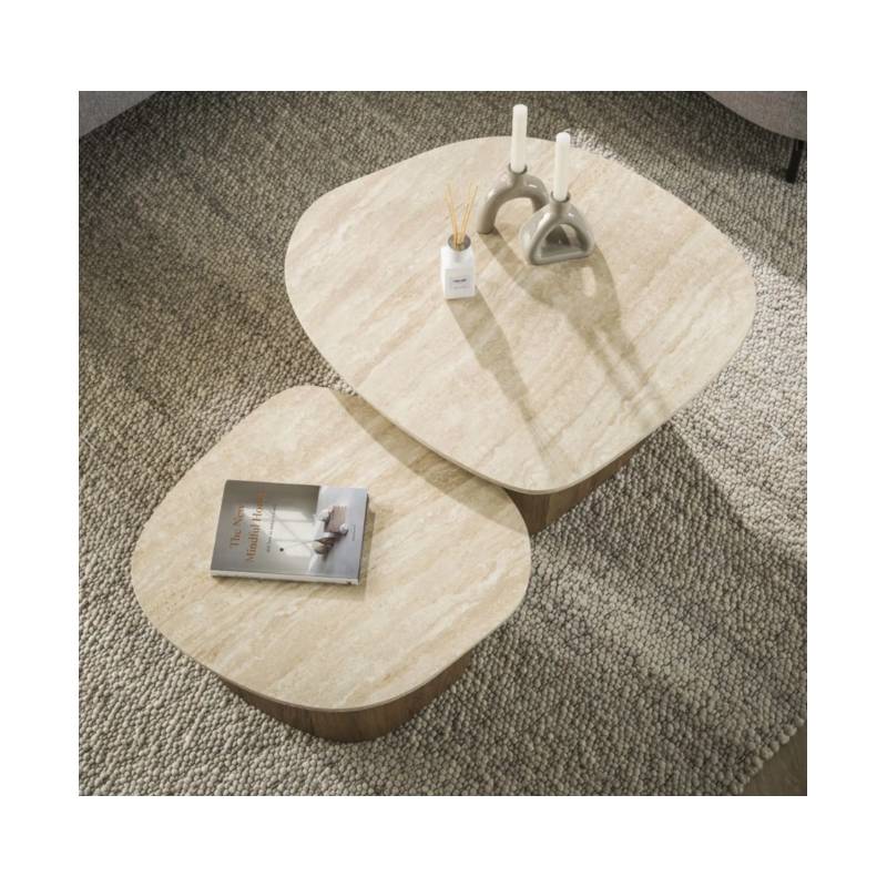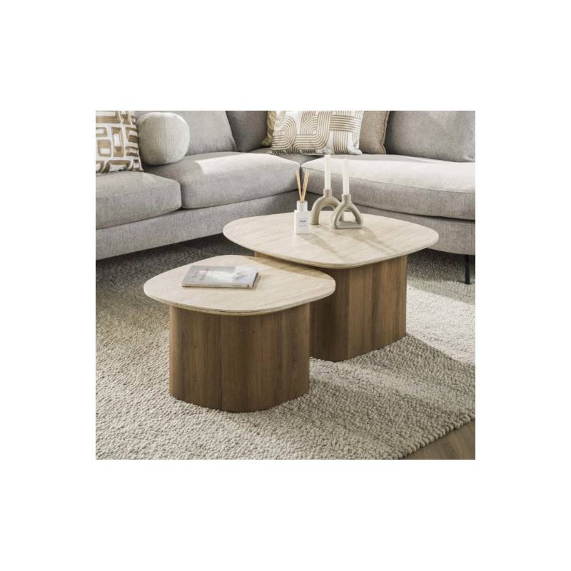 Dviejų kavos staliukų komplektas su travertino imitacijos keramika ir ąžuolo išvaizdos pagrindu, modernus ir praktiškas.