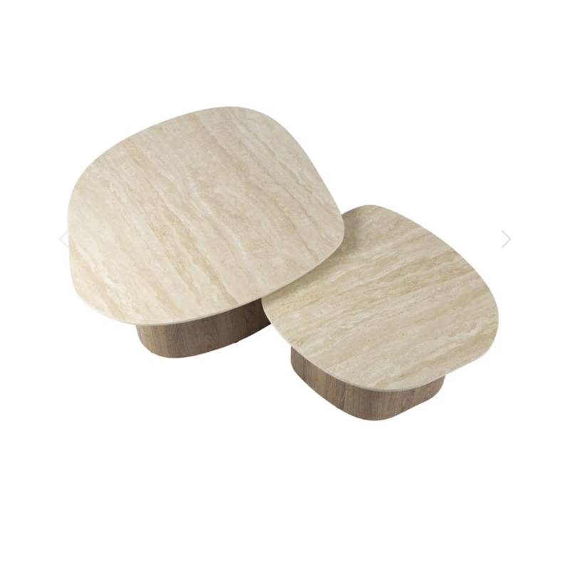 ROMA kavos staliukų komplektas pasižymi išskirtine akmenėlių forma ir elegantišku travertino imitacijos keramikinio paviršiaus dizainu. Apvalintos kolonos formos kojos su šilto ąžuolo išvaizda suteikia baldui natūralumo ir vizualinio lengvumo.
