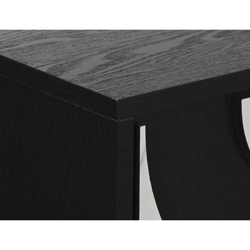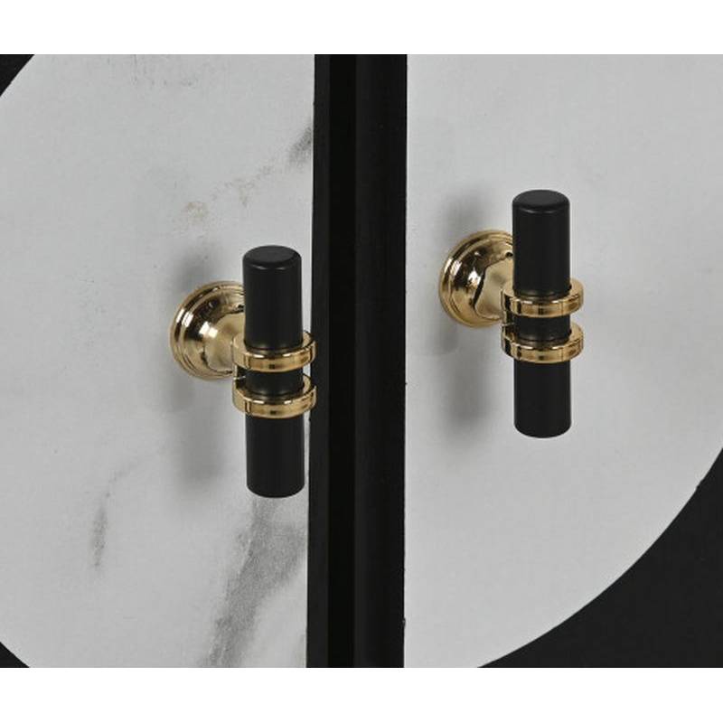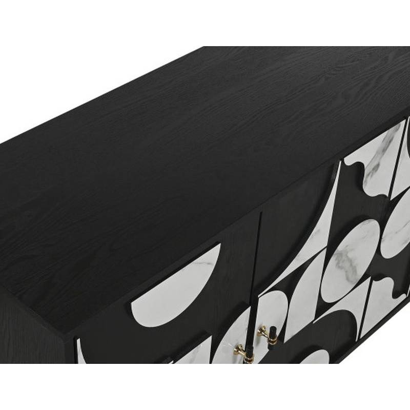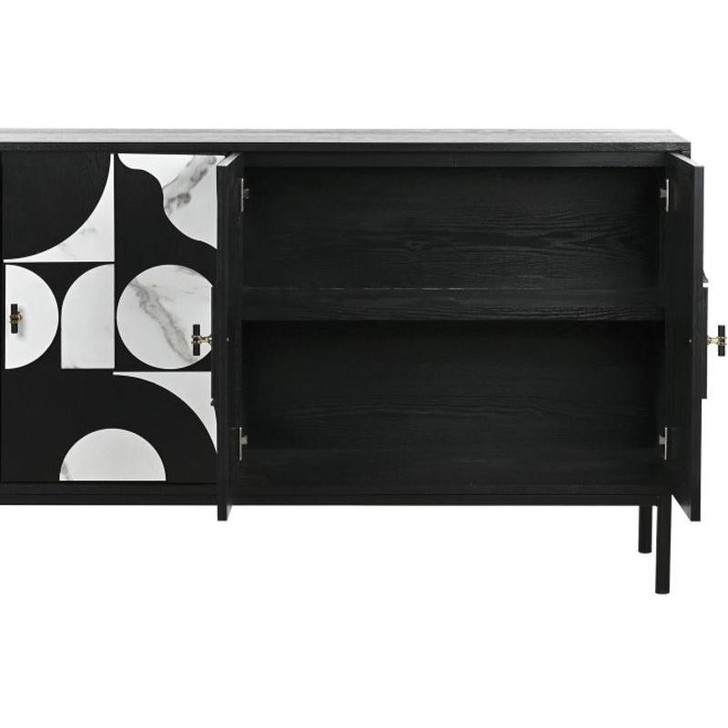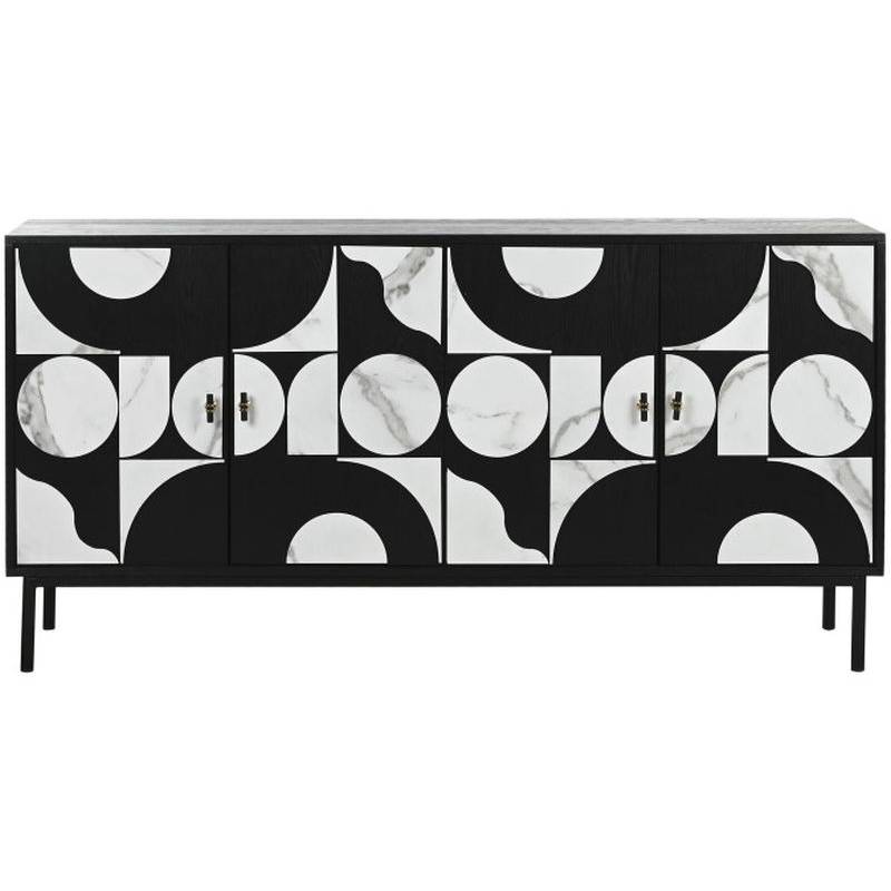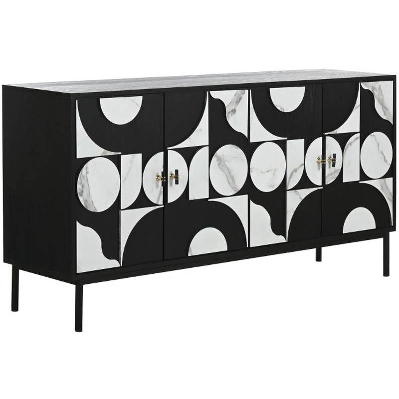 Komoda ABETO dekoruota juodos ir baltos spalvos plokšte su keturiomis durelėmis, rankenėlės su aukso detalėmis puikiai derės Jūsų interjere.