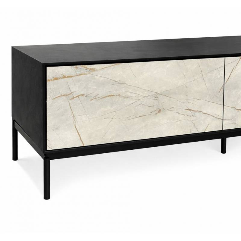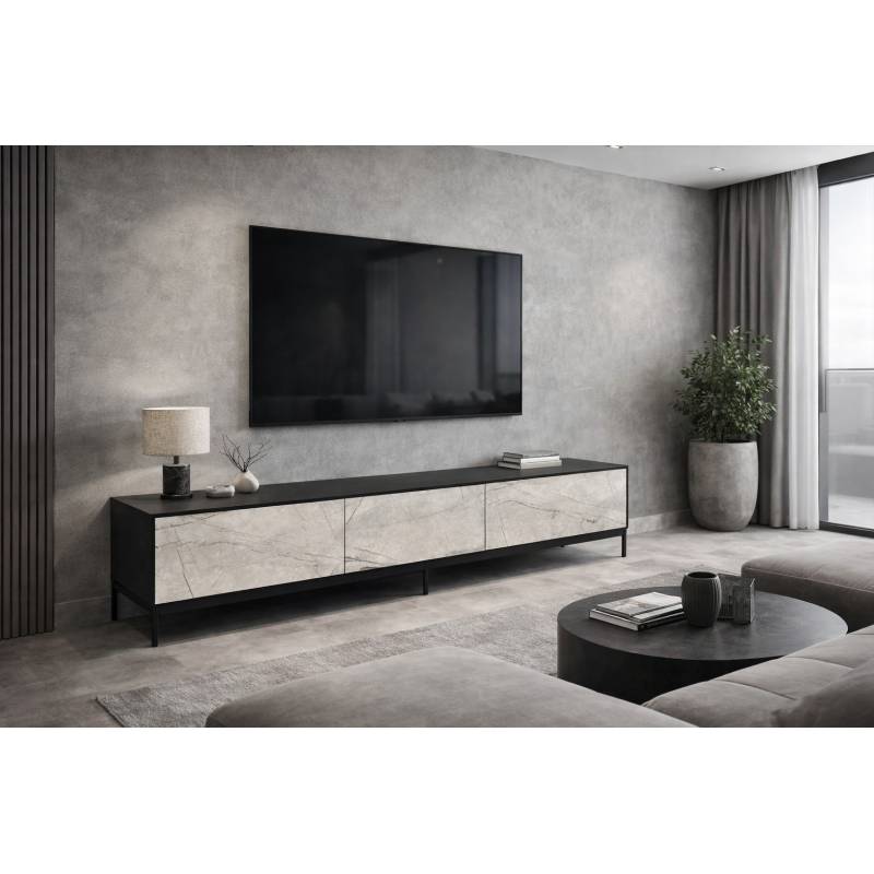 Unikalaus dizaino TV staliukas COMO. Pagamintas iš itin atsparios HPL plokštės su juodomis, metalinėmis kojelėmis ir juodu karkasu. Turi 2 stalčius ir vieną spintelę.