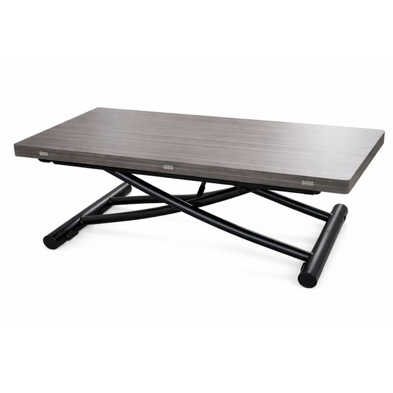 Pakeliamas kavos staliukas su rusvu stalviršiu ir juodomis kojomis, lengvai transformuojamas patogiam naudojimui tiek poilsiui, tiek valgymui.