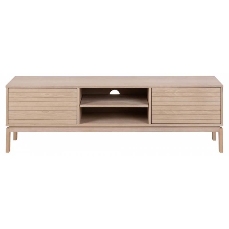 Ši TV spintelė išsiskiria švariu, harmoningų linijų dizainu ir šviesinto ąžuolo atspalviu, kuris suteikia interjerui lengvumo bei natūralios estetikos. Lamelės fasadai kuria subtilų vizualinį efektą ir suteikia baldui išskirtinumo.