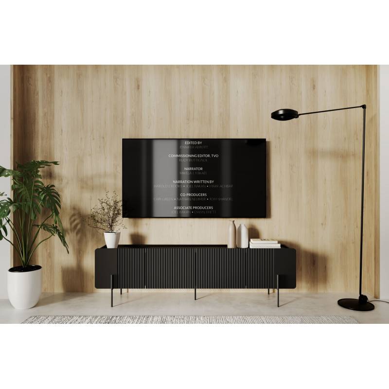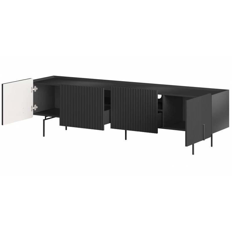 Moderni TV spintelė su grioveliais, metalinėmis kojelėmis ir praktiškais stalčiais – stilingas ir funkcionalus baldas Jūsų svetainei.