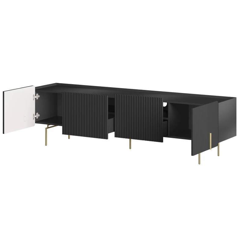 Moderni TV spintelė su grioveliais, metalinėmis kojelėmis ir praktiškais stalčiais – stilingas ir funkcionalus baldas Jūsų svetainei.
