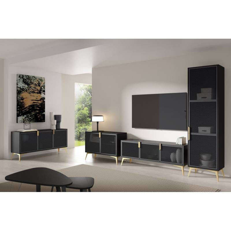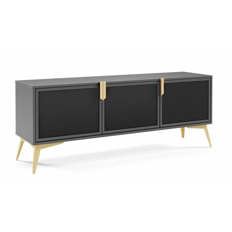 TV spintelė VARIO – modernus baldas su metaline tinklelio faktūra ir auksiniais akcentais, idealiai tinkantis šiuolaikinei svetainei.