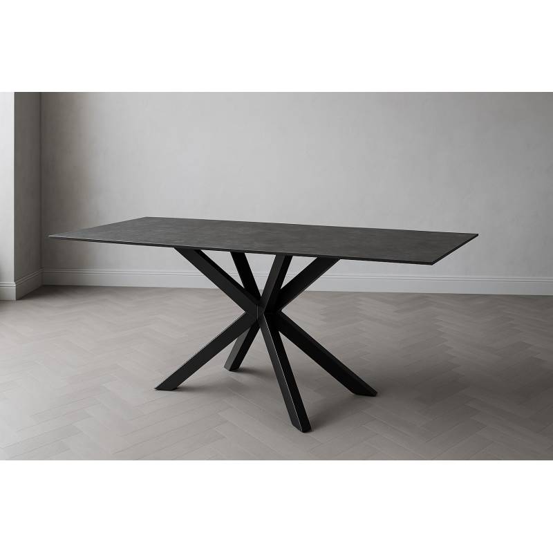 Valgomojo stalas TERRY – 160x90x75 cm, pilkai rudo keraminio paviršiaus FAIRBANKS stalviršiu. Stilingas ir praktiškas pasirinkimas.