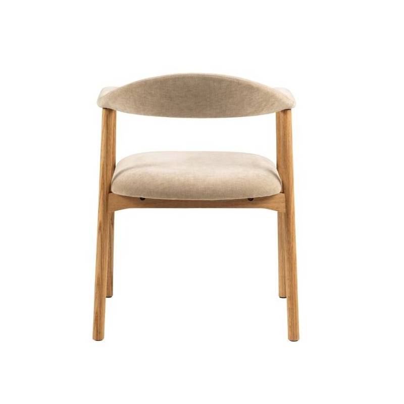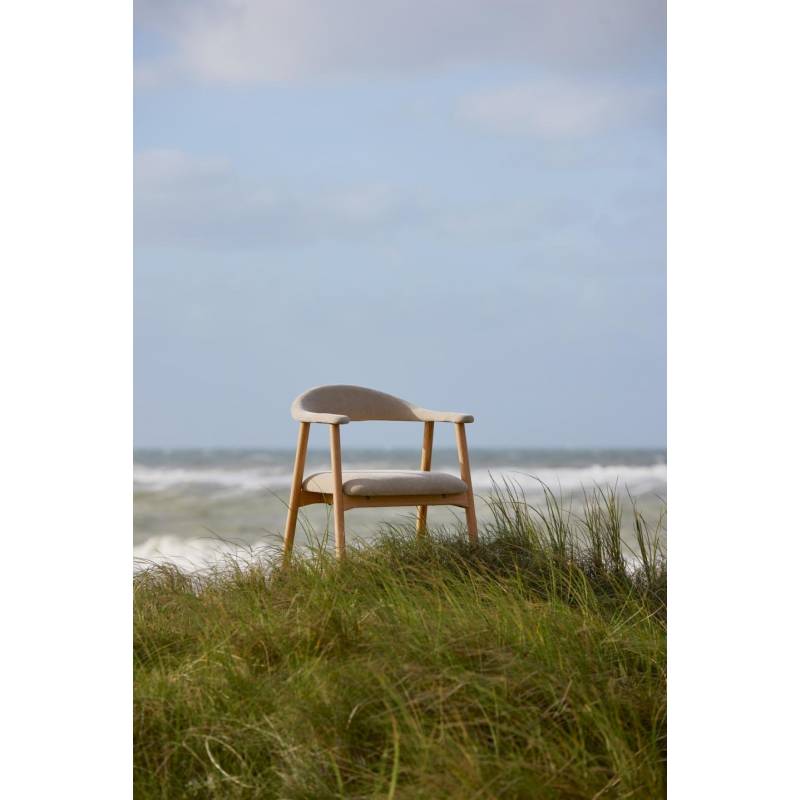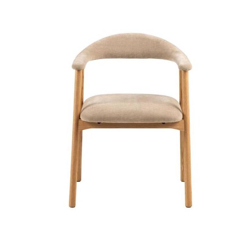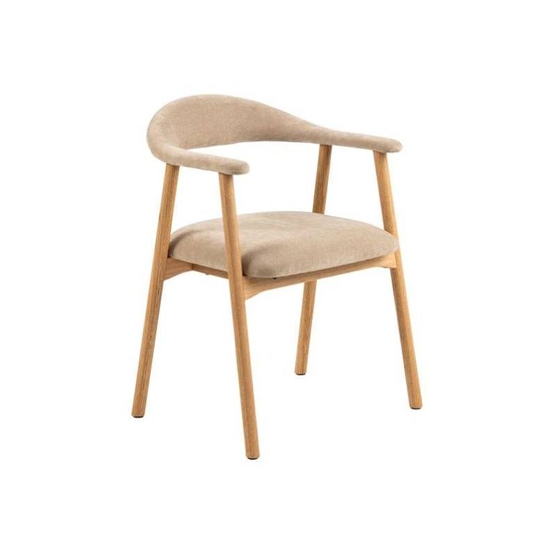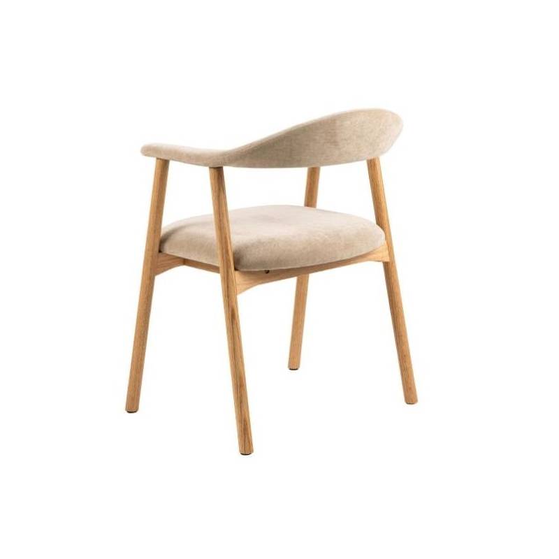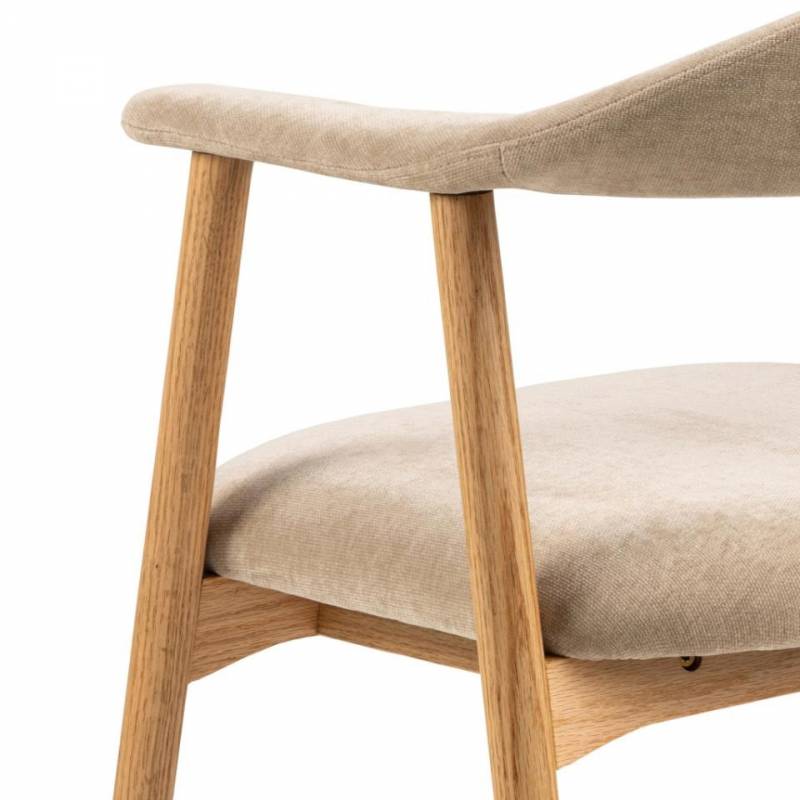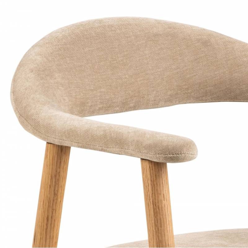 Sėdimoji dalis ir atlošas aptraukti minkštu audiniu, smėlio spalvos. Šis audinys ne tik malonus liesti, bet ir vizualiai įsilieja į šiuolaikinius, neutralius interjerus. Dėl integruotų porankių kėdė yra ne tik stilinga, bet ir labai patogi ilgoms vakarienėms ar pokalbiams prie stalo.