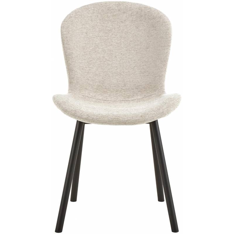 Sėdimoji dalis aptraukta šviesiai rusvos spalvos audiniu, kuriame panaudoti šenilinio tipo siūlai. Audinys švelnus liesti, tekstūriškas ir vizualiai šiltas, todėl suteikia kėdei jaukumo. Dėl neutralaus atspalvio ši kėdė lengvai derinama tiek prie medinių, tiek prie metalinių stalų.