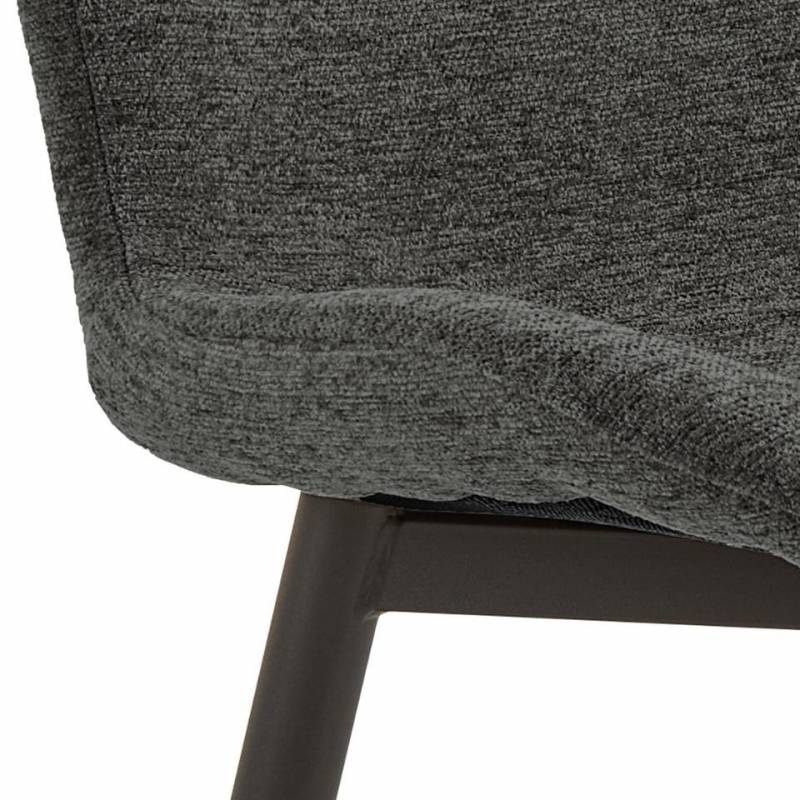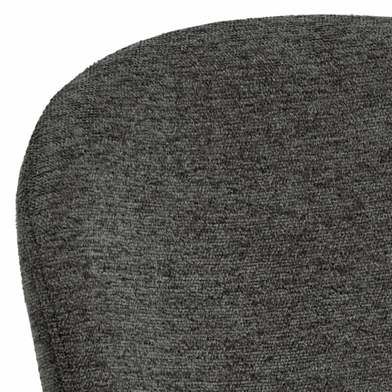 Sėdimoji dalis aptraukta tamsiai pilkos spalvos audiniu, kuriame panaudoti šenilinio tipo siūlai. Audinys švelnus liesti, tekstūriškas ir vizualiai šiltas, todėl suteikia kėdei jaukumo. Dėl neutralaus atspalvio ši kėdė lengvai derinama tiek prie medinių, tiek prie metalinių stalų.
