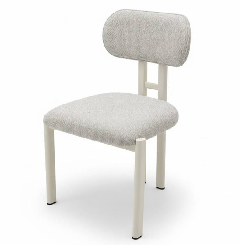 Stilingo dizaino valgomojo kėdė BADE. Šviesios spalvos gobeleno, kreminėmis kojomis. Kojų dizainas taip pat modernus, galinės kojos suvestos į vidurį, sutvirtintos papildomais sujungimais. Nugaros atrama šiek tiek išlenkta, turi stambų apsiuvimą. Kėdės dalys užapvalintais kampais.