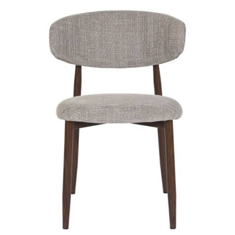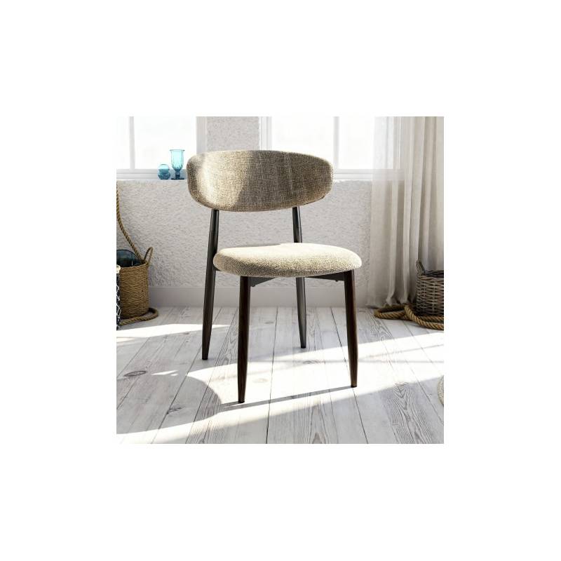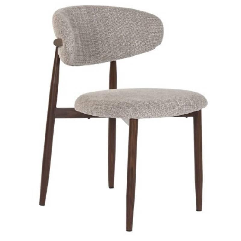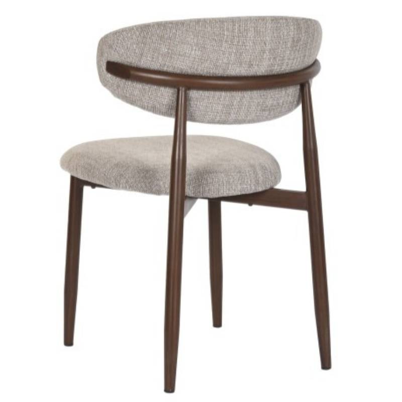 Šviesaus atspalvio kėdė su metalo konstrukcija ir medžio imitacijos detalėmis, suteikianti interjerui jaukumo ir šiuolaikiško lengvumo.