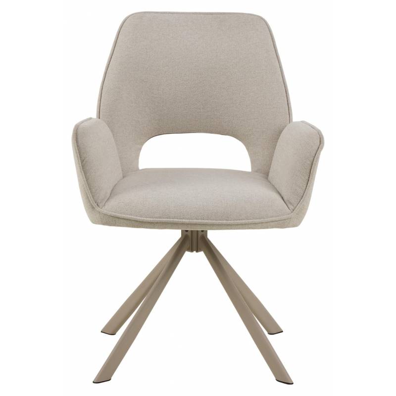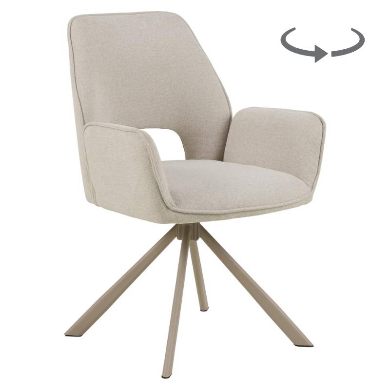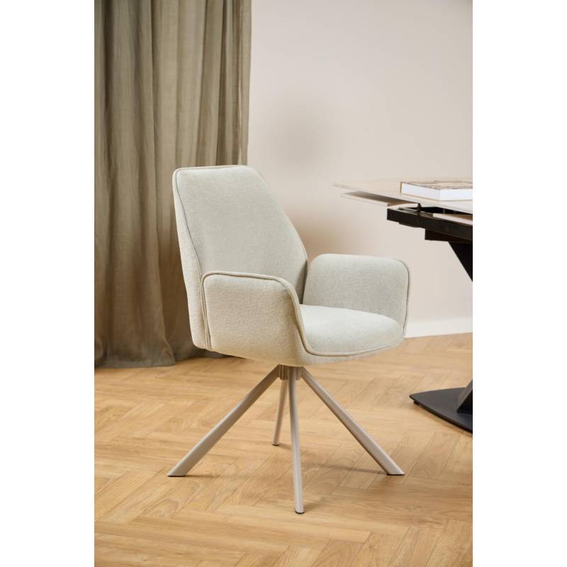 Elegantiška valgomojo kėdė su porankiais ir sukimosi funkcija, suteikianti komfortą ir išskirtinį stilių.