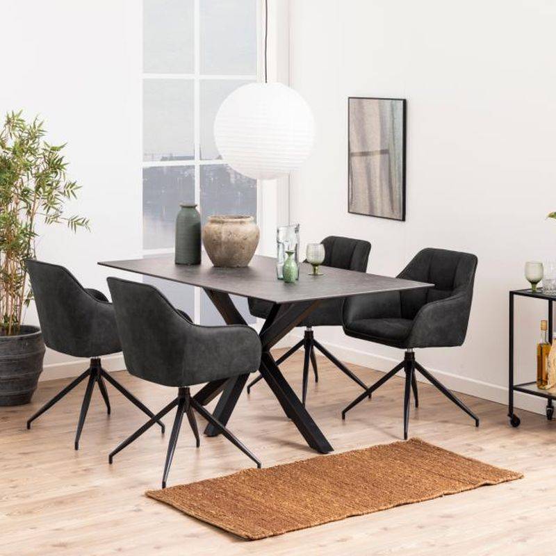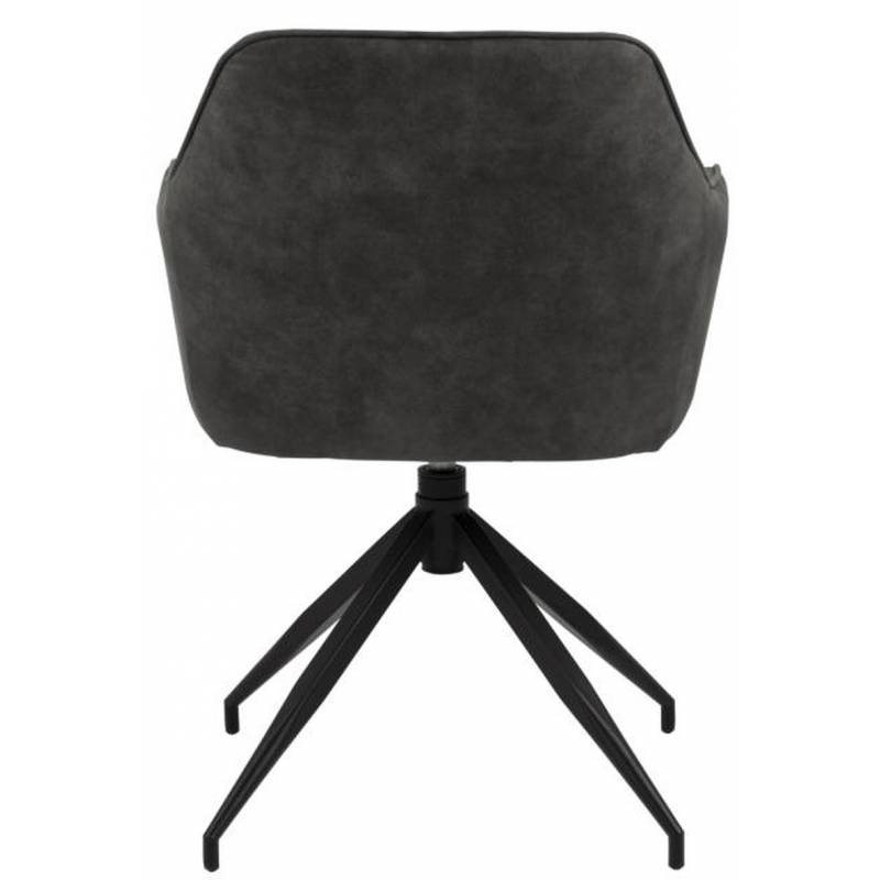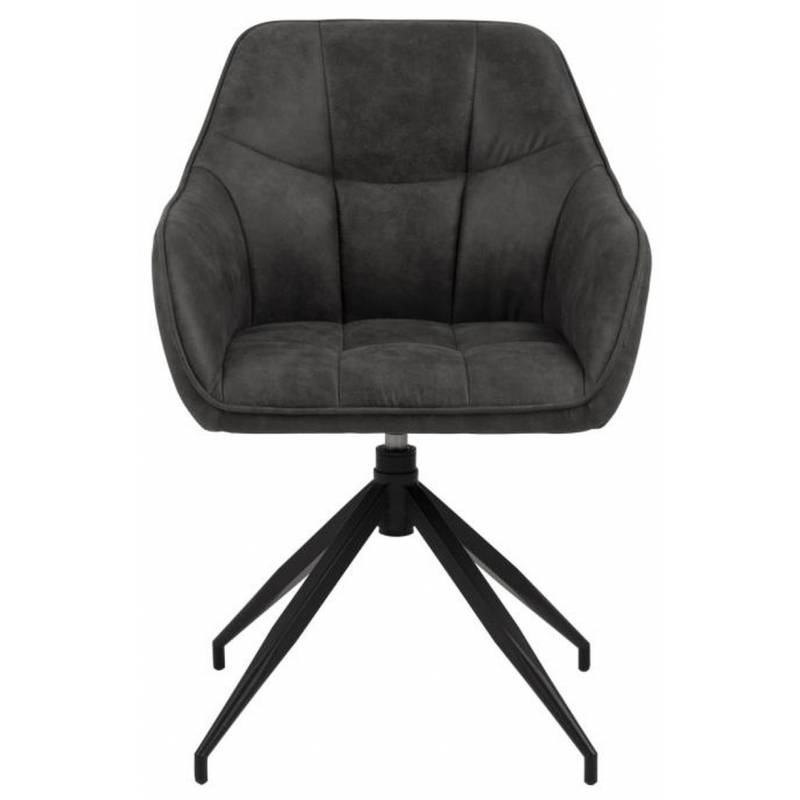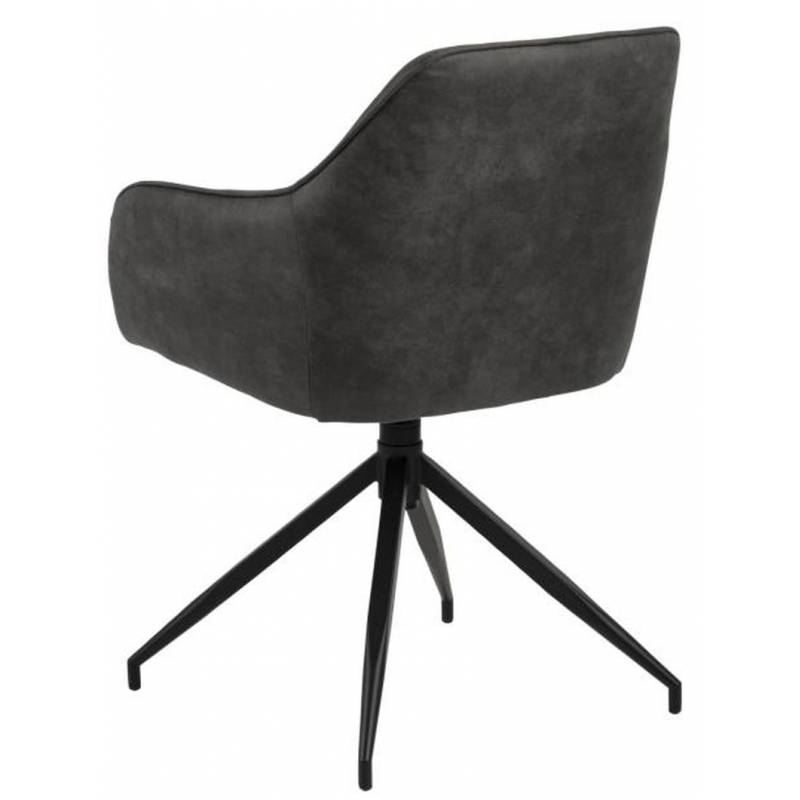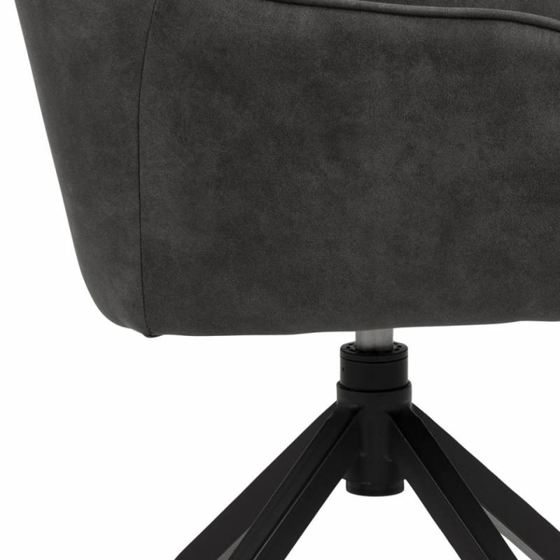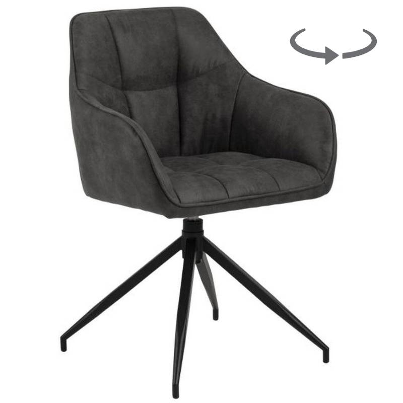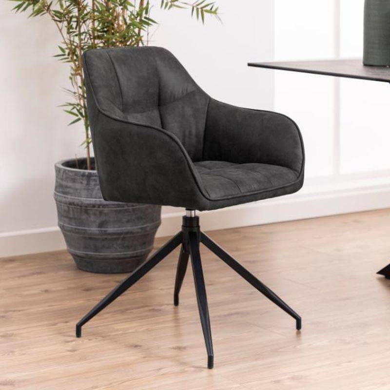 Moderni valgomojo kėdė su porankiais, pasukamu mechanizmu ir antracito spalvos apmušalu, užtikrinanti komfortą ir šiuolaikišką estetiką.