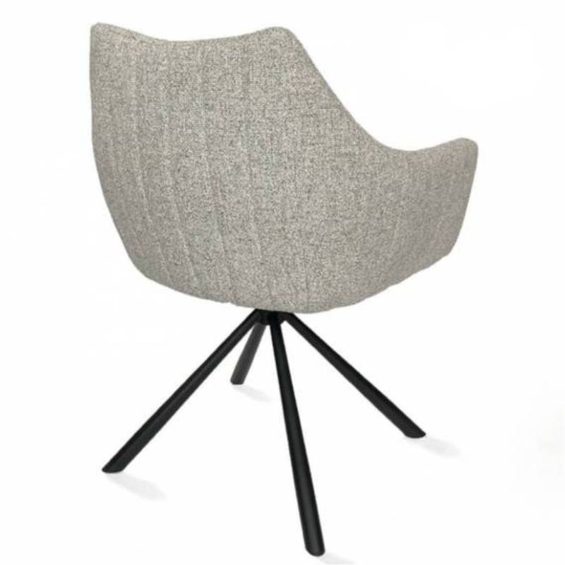 Valgomojo krėsliukas MILAN su juodai dažytomis metalinėmis kojelėmis ir pilku gobelenu apmušta sėdimąja dalimi. Su porankiais. Ši kėdė turi sukimosi funkciją. Tai taip pat galima naudoti kaip poilsio ar rašomojo stalo kėdę.