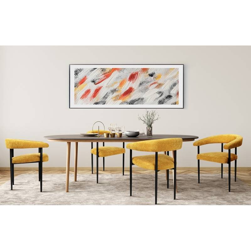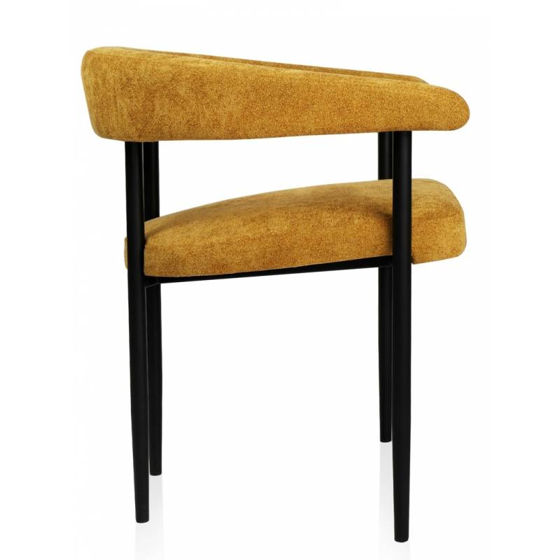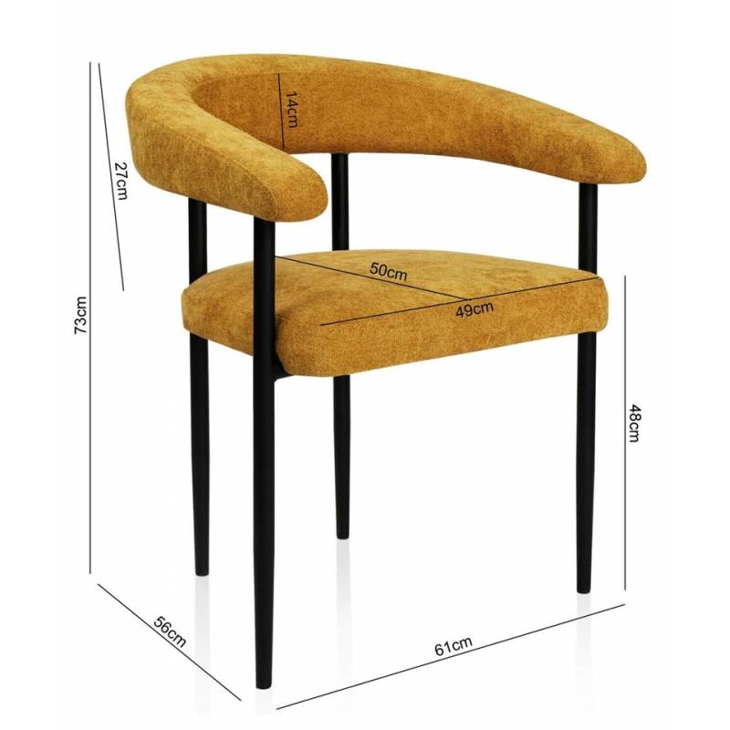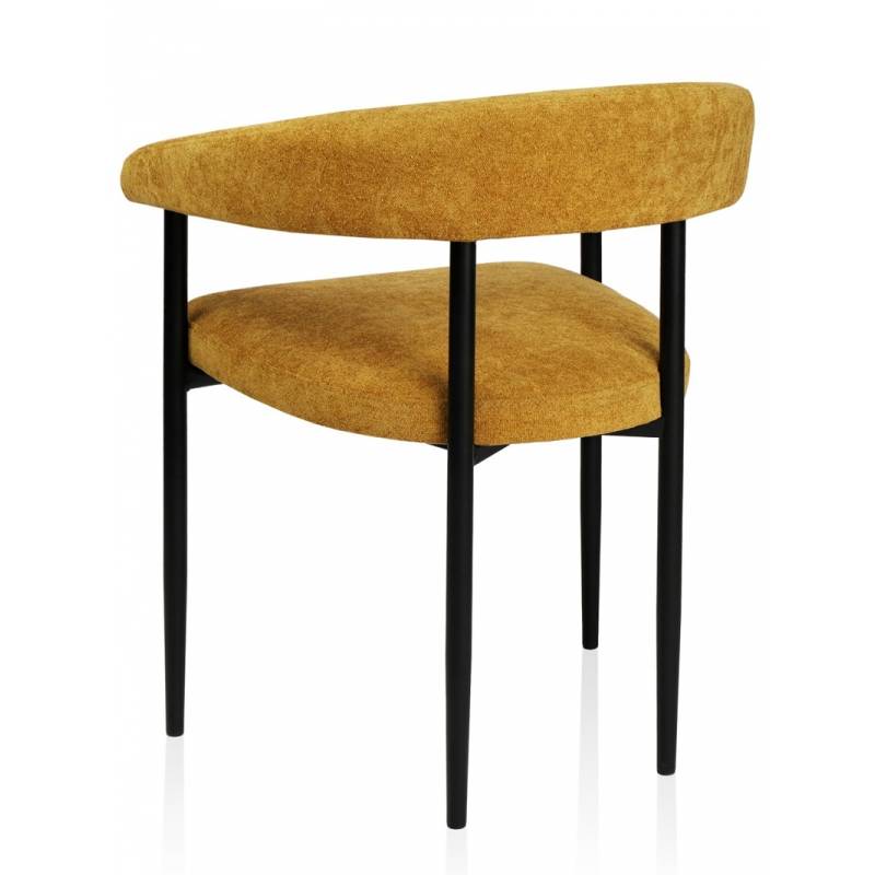 Šiuolaikinio minimalistinio dizaino krėsliukas ORIO taps bet kokio valgomojo puošmena. Krėsliukas aptrauktas geltonos spalvos gobelenu. Su juodomis metalinėmis kojelėmis iš metalo, dažyto milteliniu būdu. Sėdimoji dalis minkšta, šiek tiek nuožulni. Nugaros atrama pereina į porankius ir apjuosia visą korpusą.