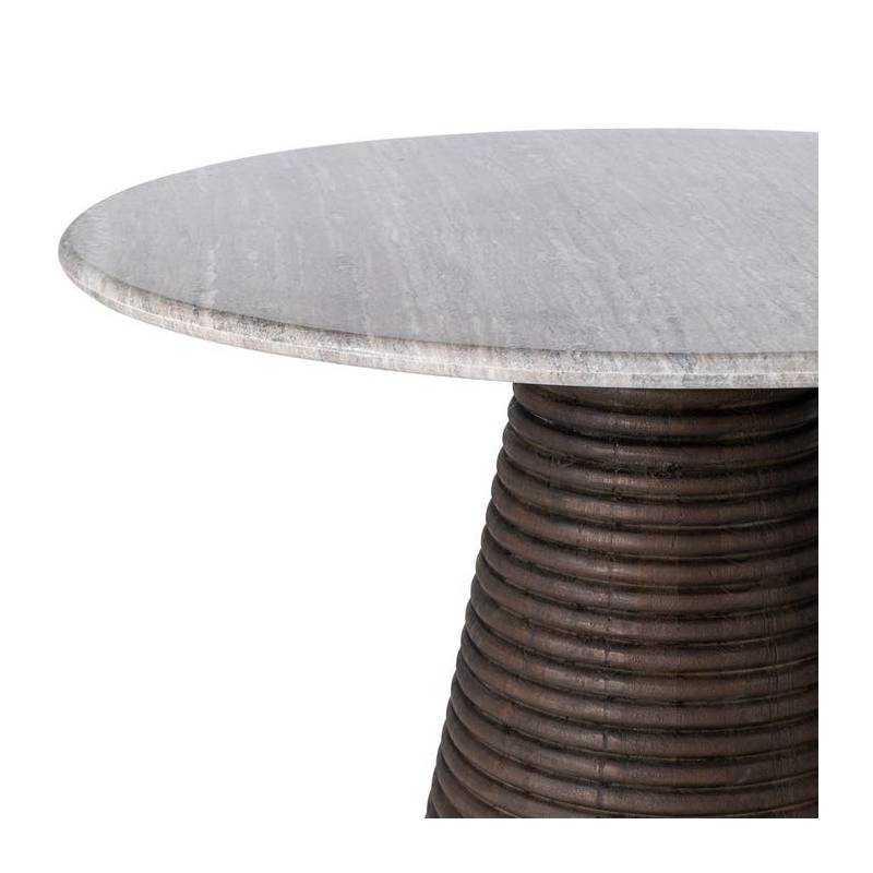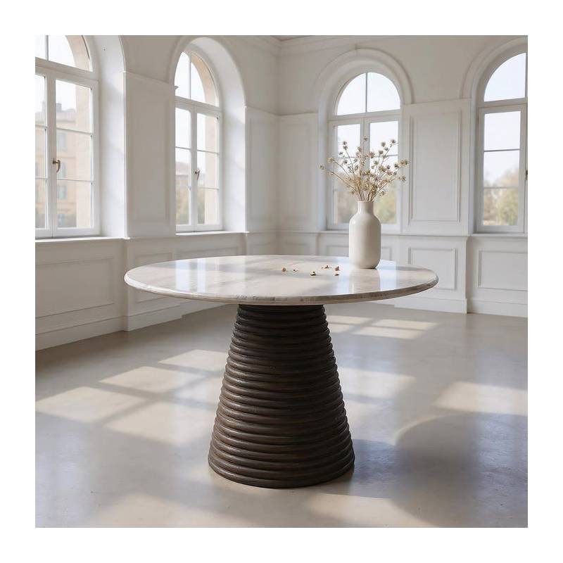 Elegantiškas valgomojo stalas su marmuro stalviršiu ir mango medienos baze – prabangus akcentas moderniam interjerui.
